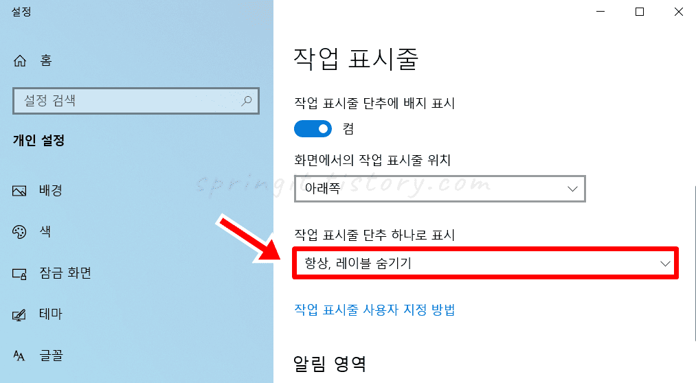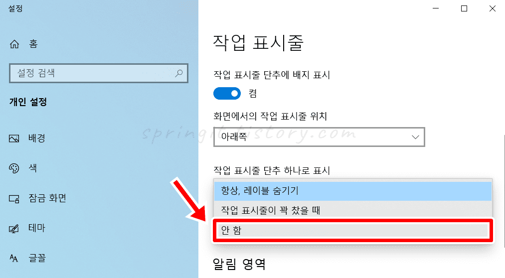 3. 작업 표시줄 단추 하나로 표시 아래의 목록을 클릭합니다.