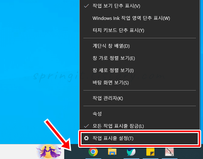 1. 윈도우10 작업표시줄을 마우스 우클릭합니다.