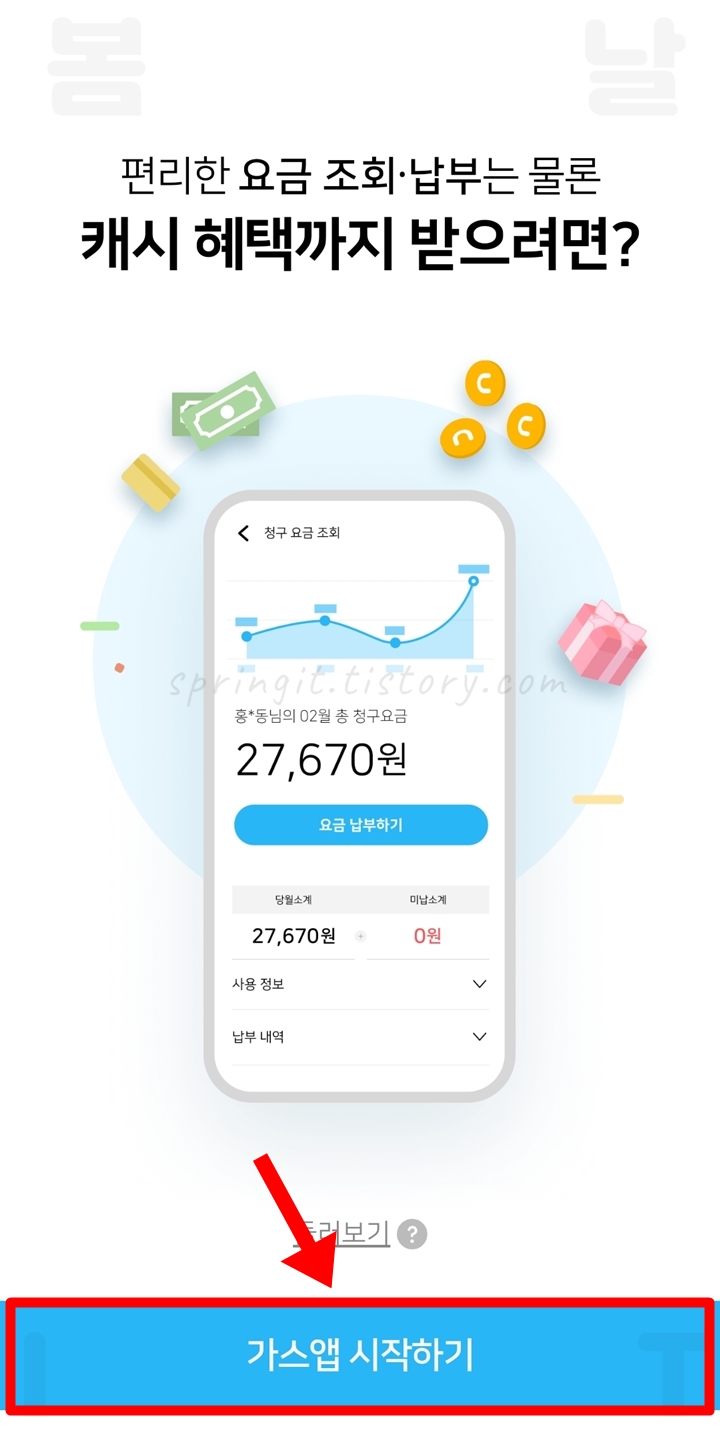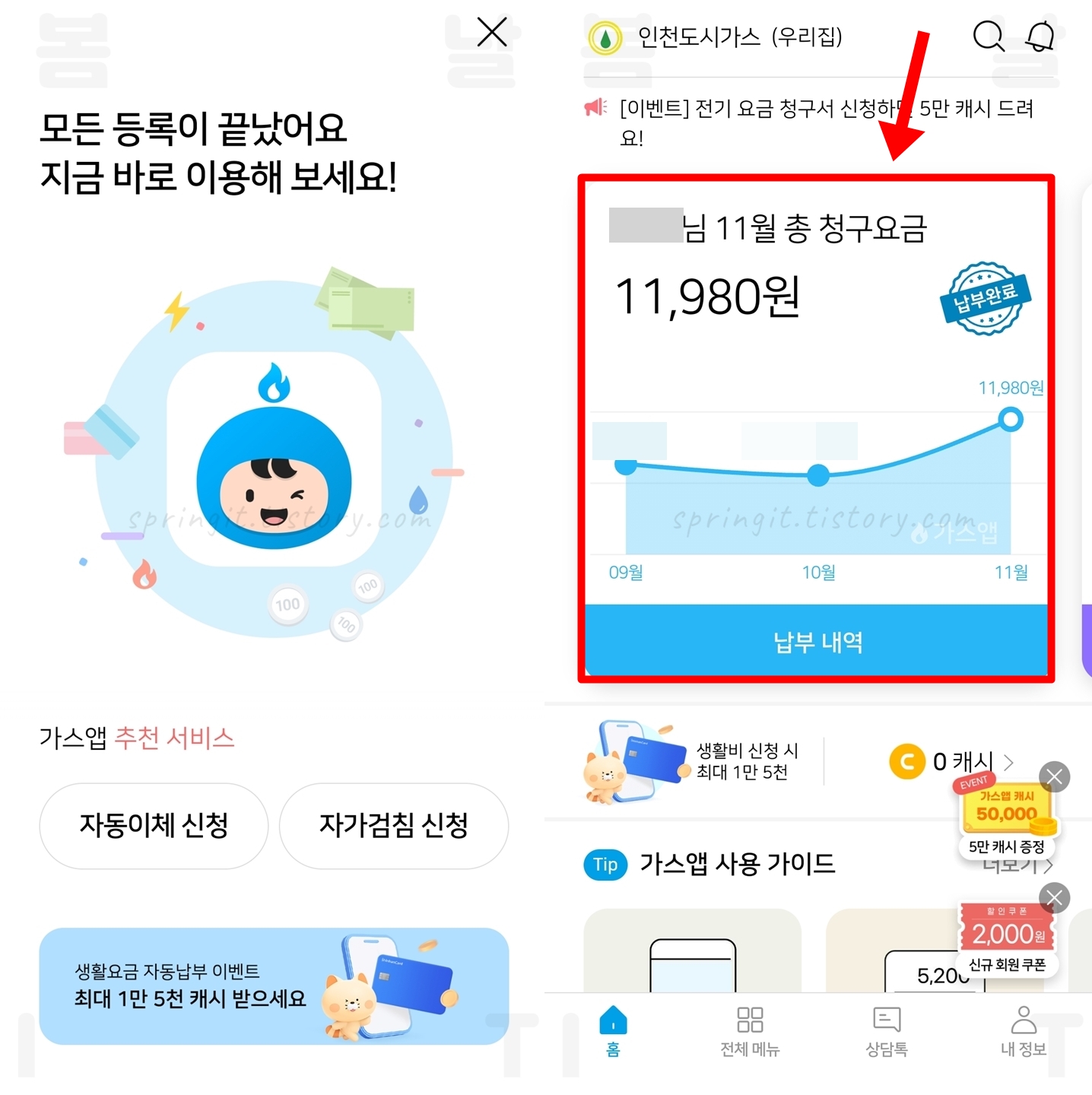8. 가스앱 가입이 완료되면 홈화면에서 도시가스 요금 조회가 가능합니다.