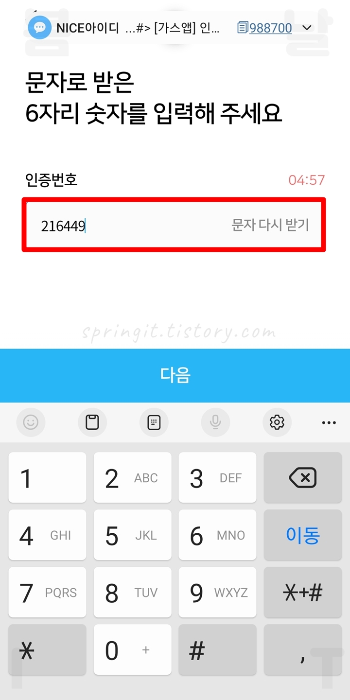 5. 휴대폰에 수신된 인증번호를 입력합니다.