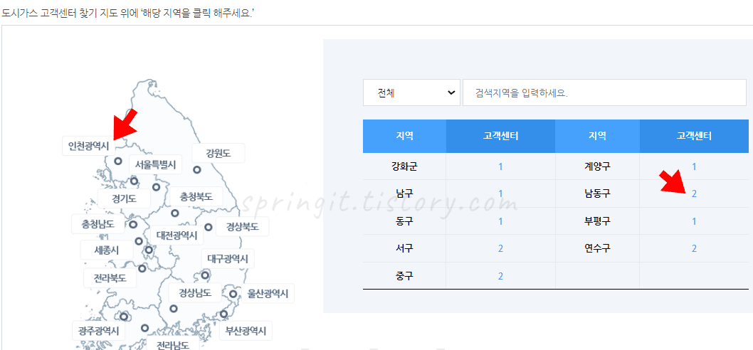 4. 검색한 지역의 도시가스업체 고객번호를 확인합니다.