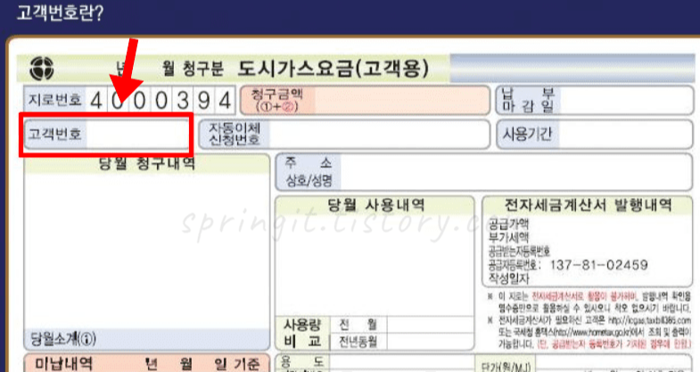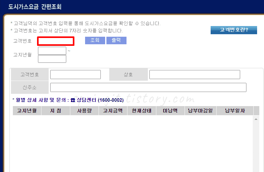여기서 고객번호란 도시가스요금 고지서에서 확인할 수 있는데요. 만약 고지서를 확인할 수 없다면 해당 도시가스업체의 고객센터로 전화하셔서 주소에 따른 고객번호를 알려달라고 요청하시면 됩니다.