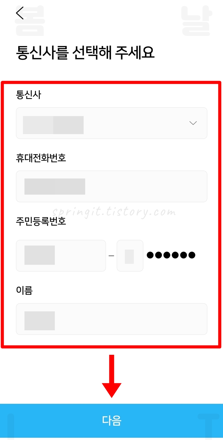 3. 나의 개인정보와 휴대폰 번호를 입력합니다.
