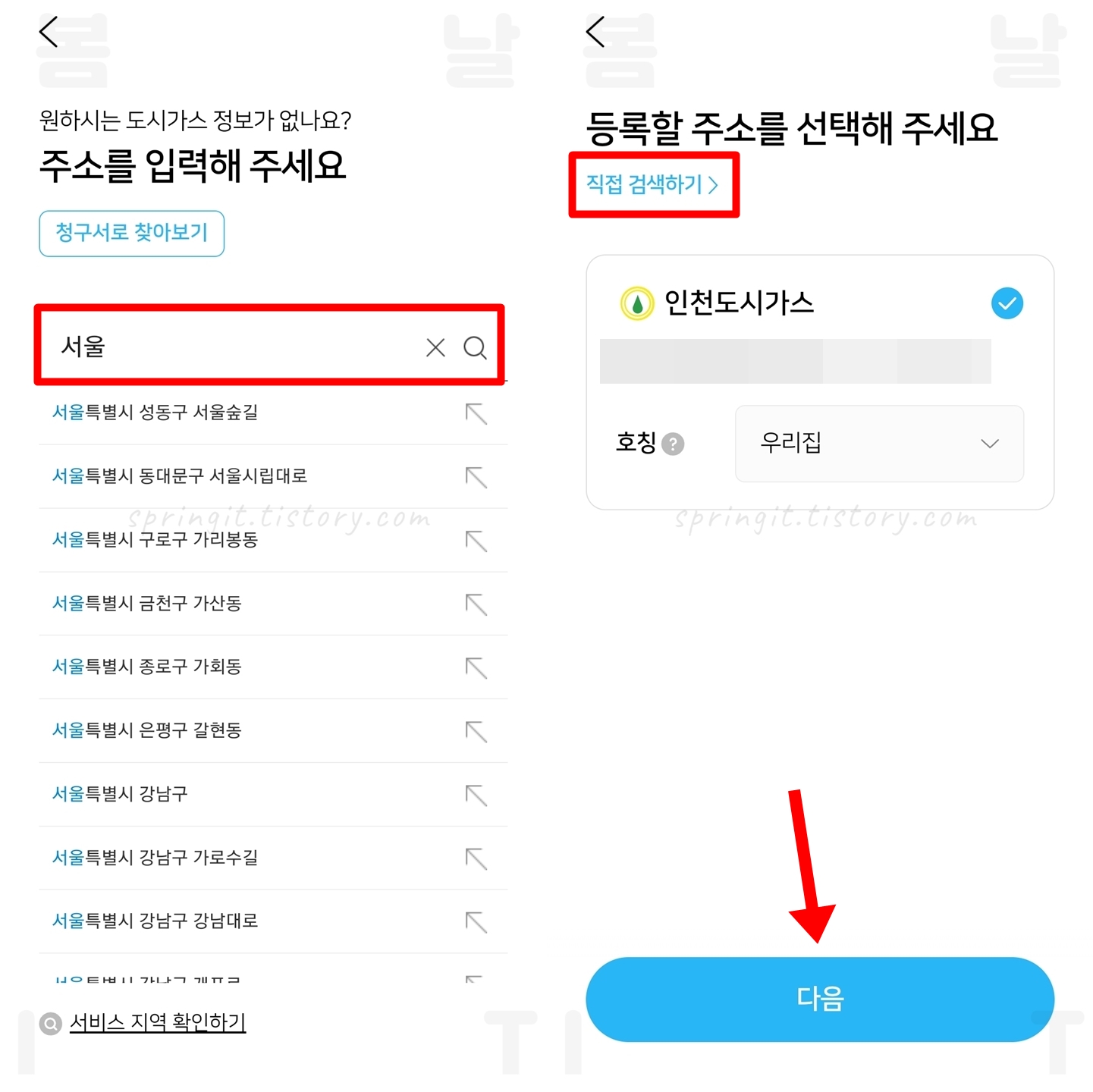 6. 도시가스 요금을 조회할 집 주소를 검색 후 설정합니다.