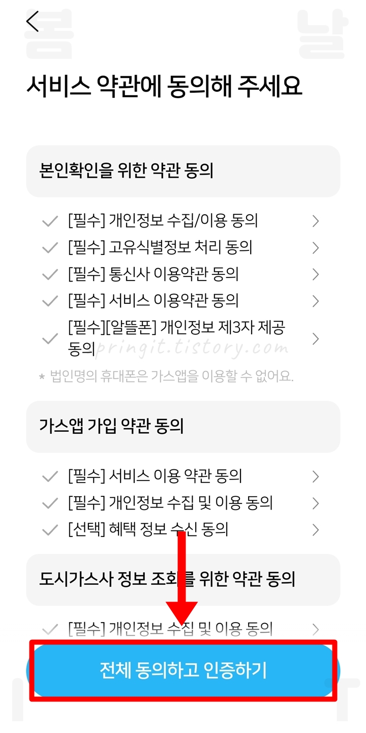 4. 서비스 약관화면에서 전체 동의하고 인증하기를 클릭합니다.