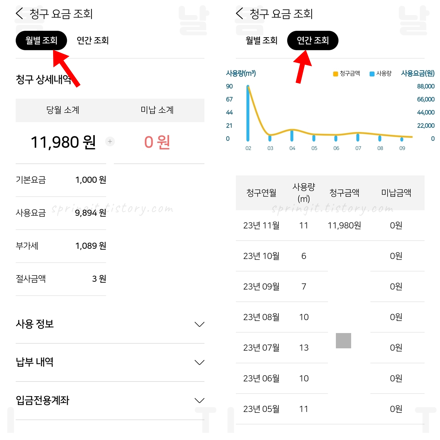 11. 월별 및 년간 도시가스 요금 조회가 가능합니다.