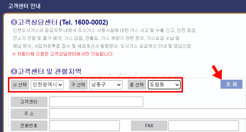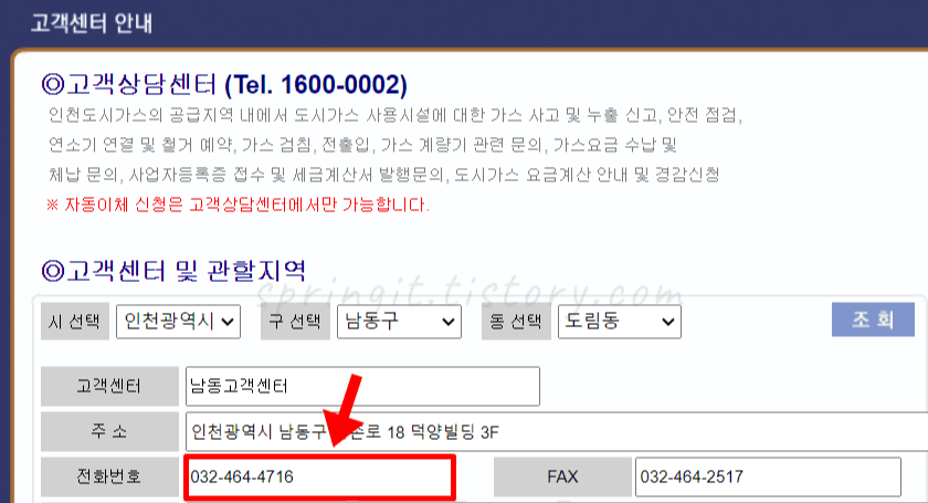 4. 검색한 지역의 도시가스업체 고객번호를 확인합니다.