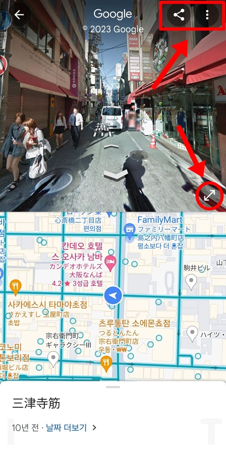 구글지도의 확대 버튼을 클릭하면 하단의 위치지도가 사라지고 넓은 화면으로 구글지도 로드뷰를 보는 것이 가능합니다. 또한 상단의 공유버튼을 눌러서 내가 보고 있는 로드뷰 화면을 다른 사용자에게 SNS 앱으로 공유하는 것도 가능하며 더보기 버튼을 누르면 검열이 필요하거나 불쾌감을 주는 이미지를 신고할 수 있습니다.