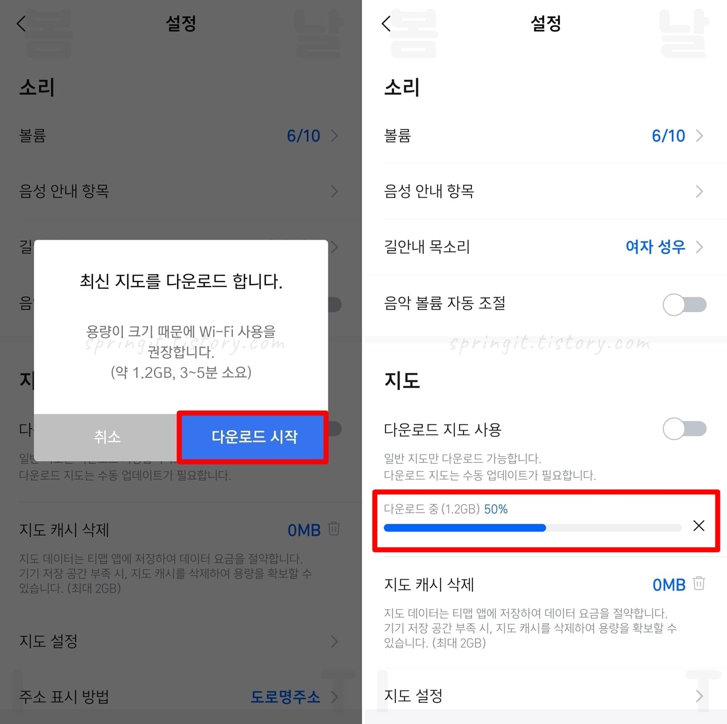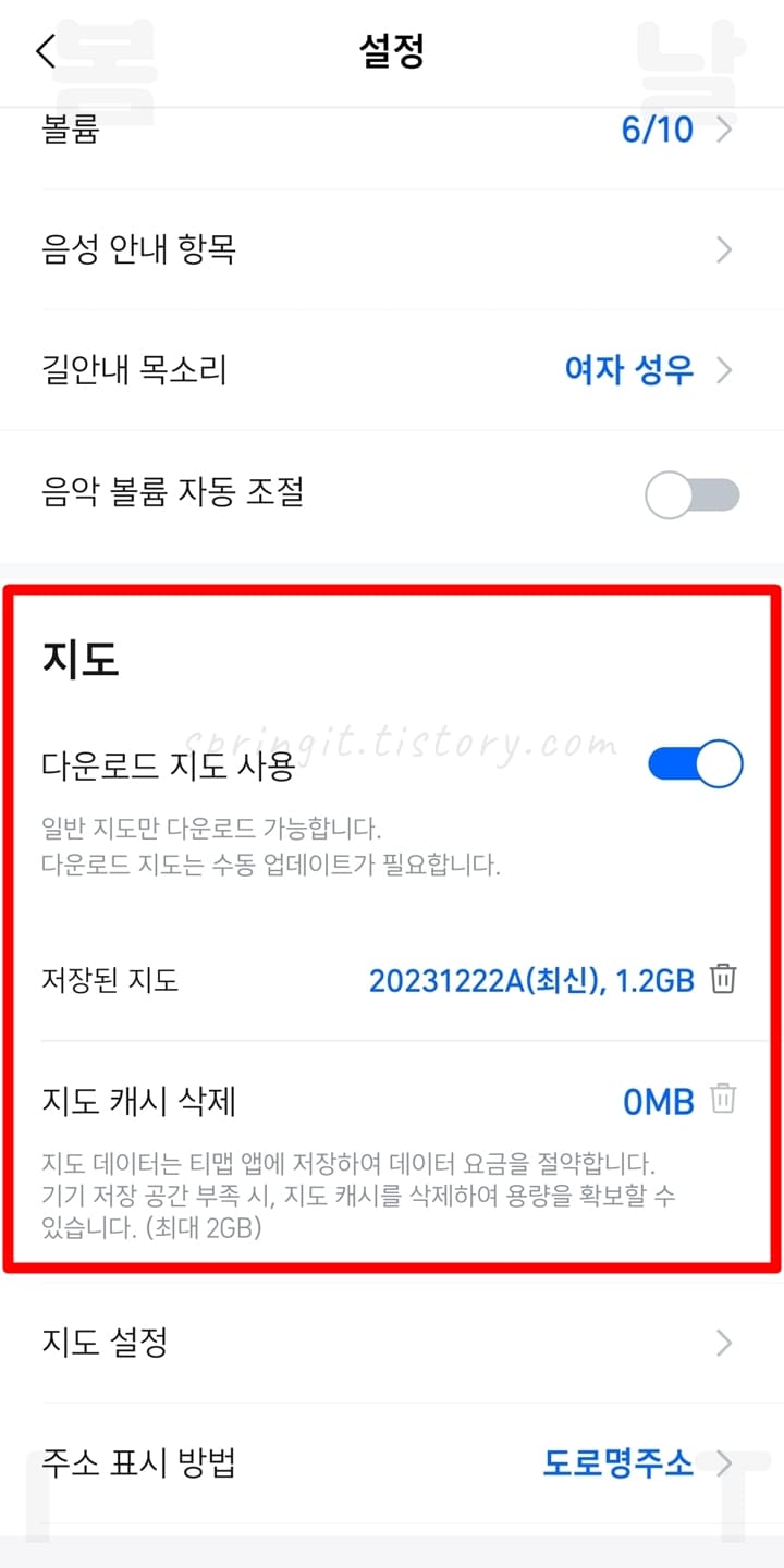 여기까지 티맵 지도 다운로드 방법을 소개드렸습니다. 참고로 티맵 다운로드 지도는 자동 업데이트를 지원하지 않으니 위 설정 화면에서 수동 업데이트를 진행해주셔야 합니다. 또한 스마트폰 저장공간이 부족하다면 지도 캐시 삭제를 눌러서 용량을 확보할 수 있으니 기억해두시길 바랍니다.