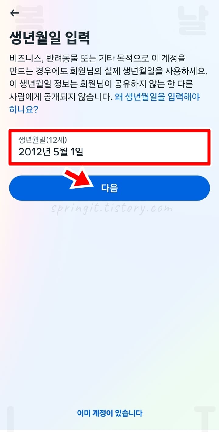 4. 나의 생일 정보를 입력하고 다음을 누릅니다.