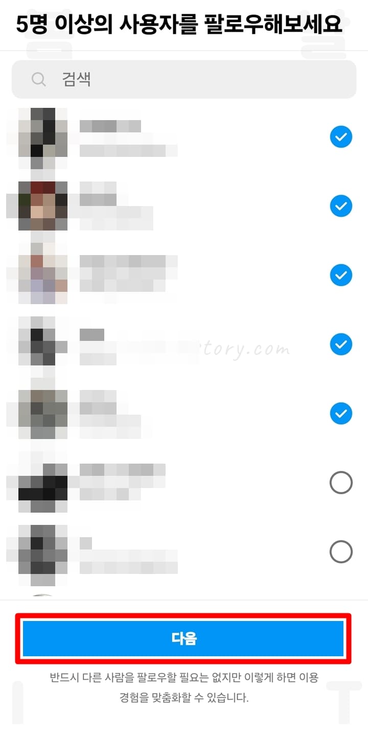 보통 이 화면에서는 유명한 인플루언서, 연예인들의 계정이 표시되는데 체크를 해제하여 팔로우를 하지 않고 다음으로 넘어갈 수도 있습니다.