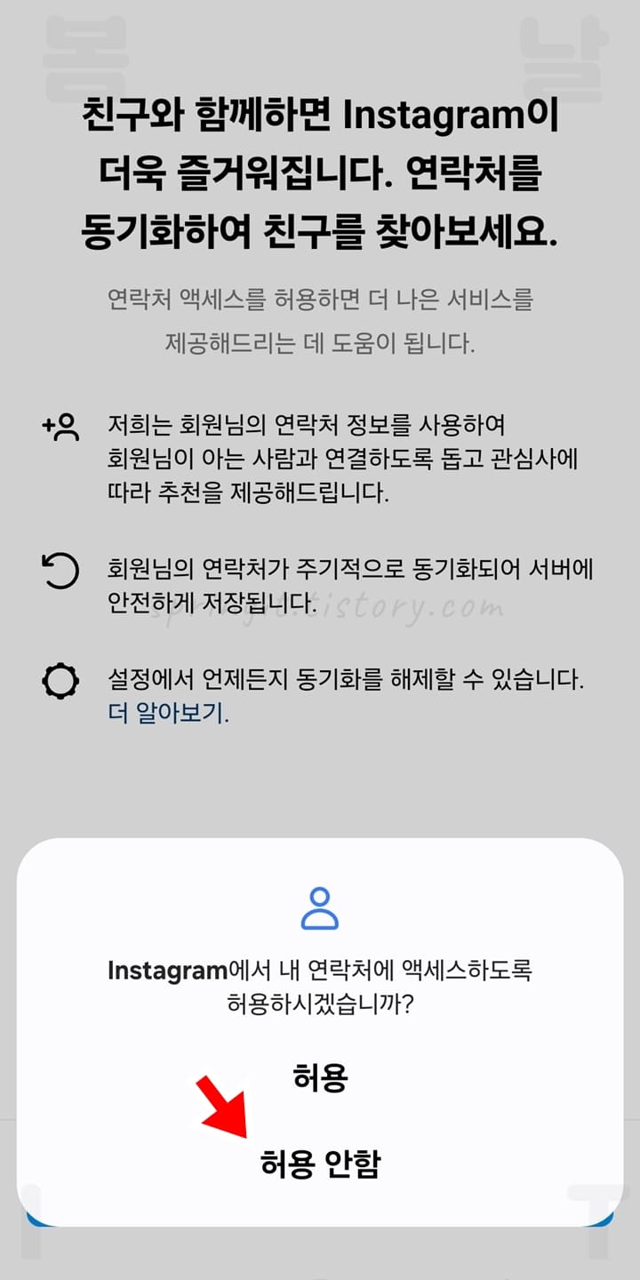 연락처 엑세스를 허용하면 나의 전화번호를 알고 있거나 내가 알고 있는 상대방들을 인스타그램에서 쉽게 찾아 추가할 수 있습니다. 만약 연락처에 저장된 친구들을 인스타그램에서 보이지 않도록 숨기고 싶다면 엑세스를 허용하지 않는 것을 추천드립니다.