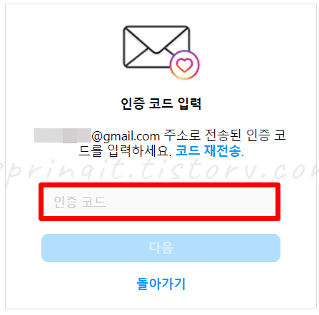 6. 인스타 앱에서 인증번호를 입력하고 다음을 클릭합니다.