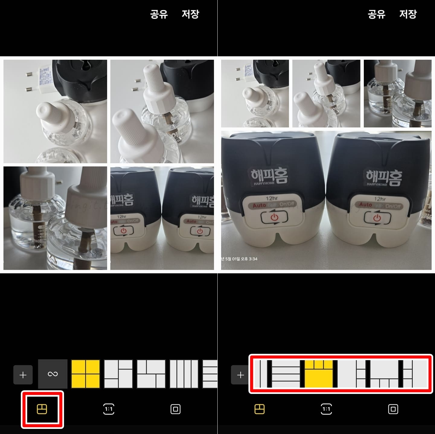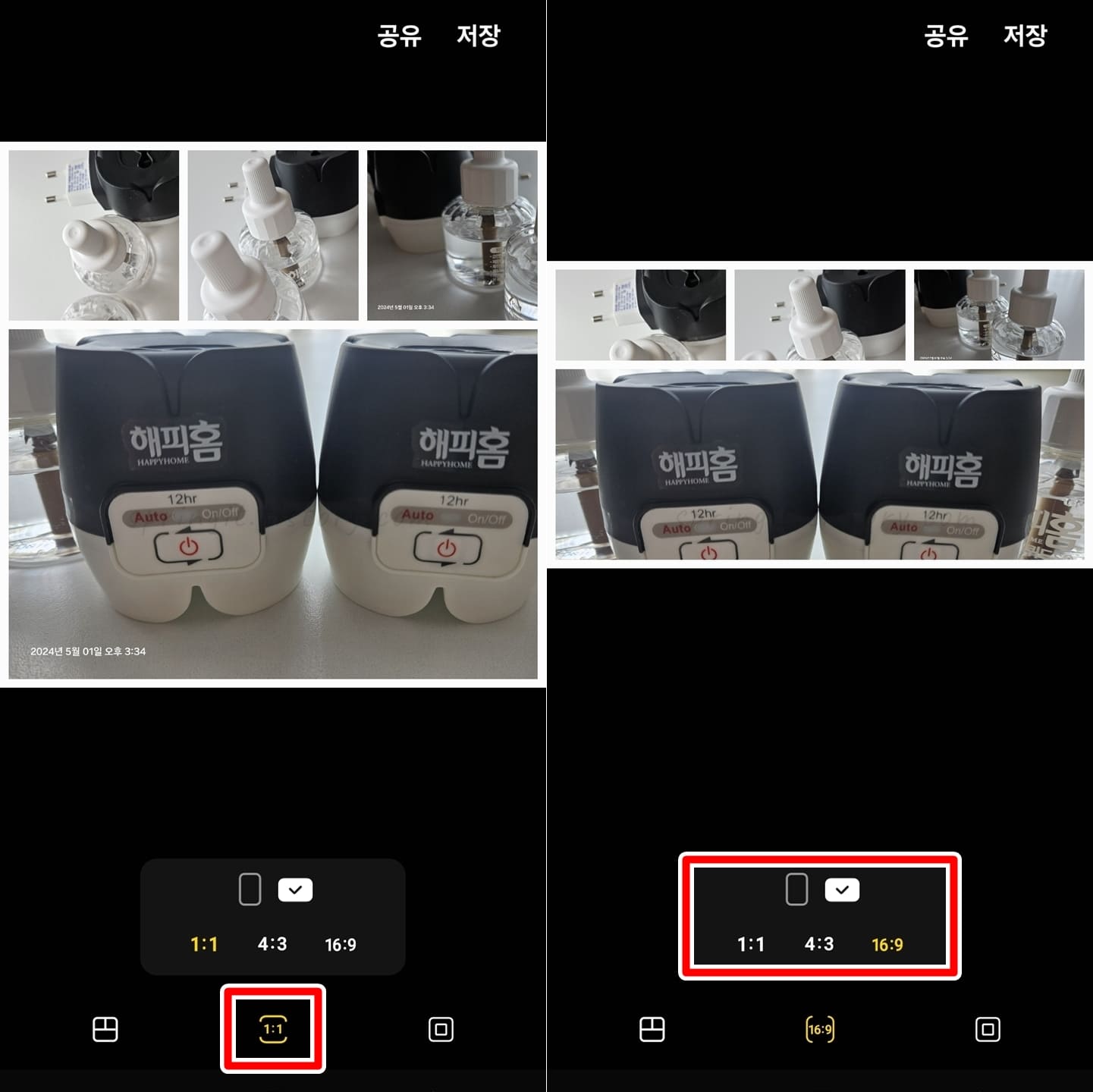 기본적으로 1:1 정사각형으로 사진들이 합쳐지지만 4:3이나 16:9 비율로 변경할 수도 있습니다.