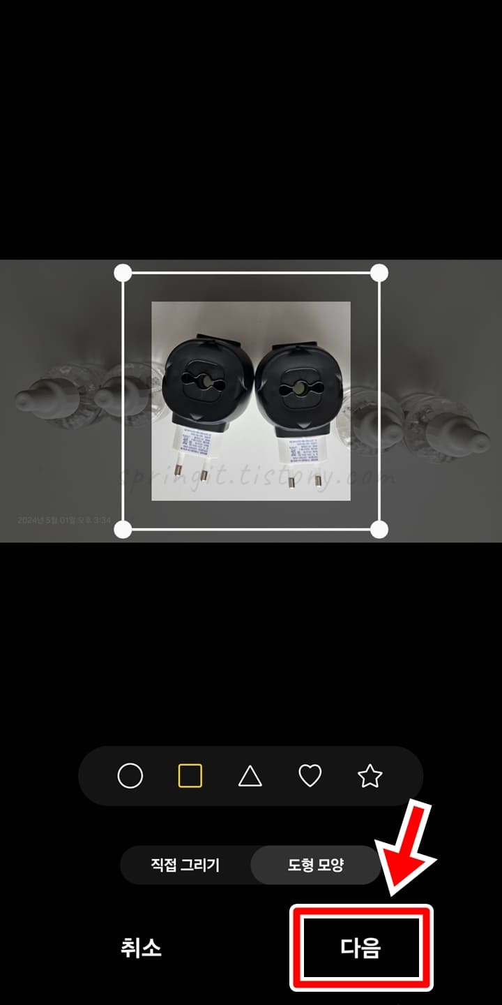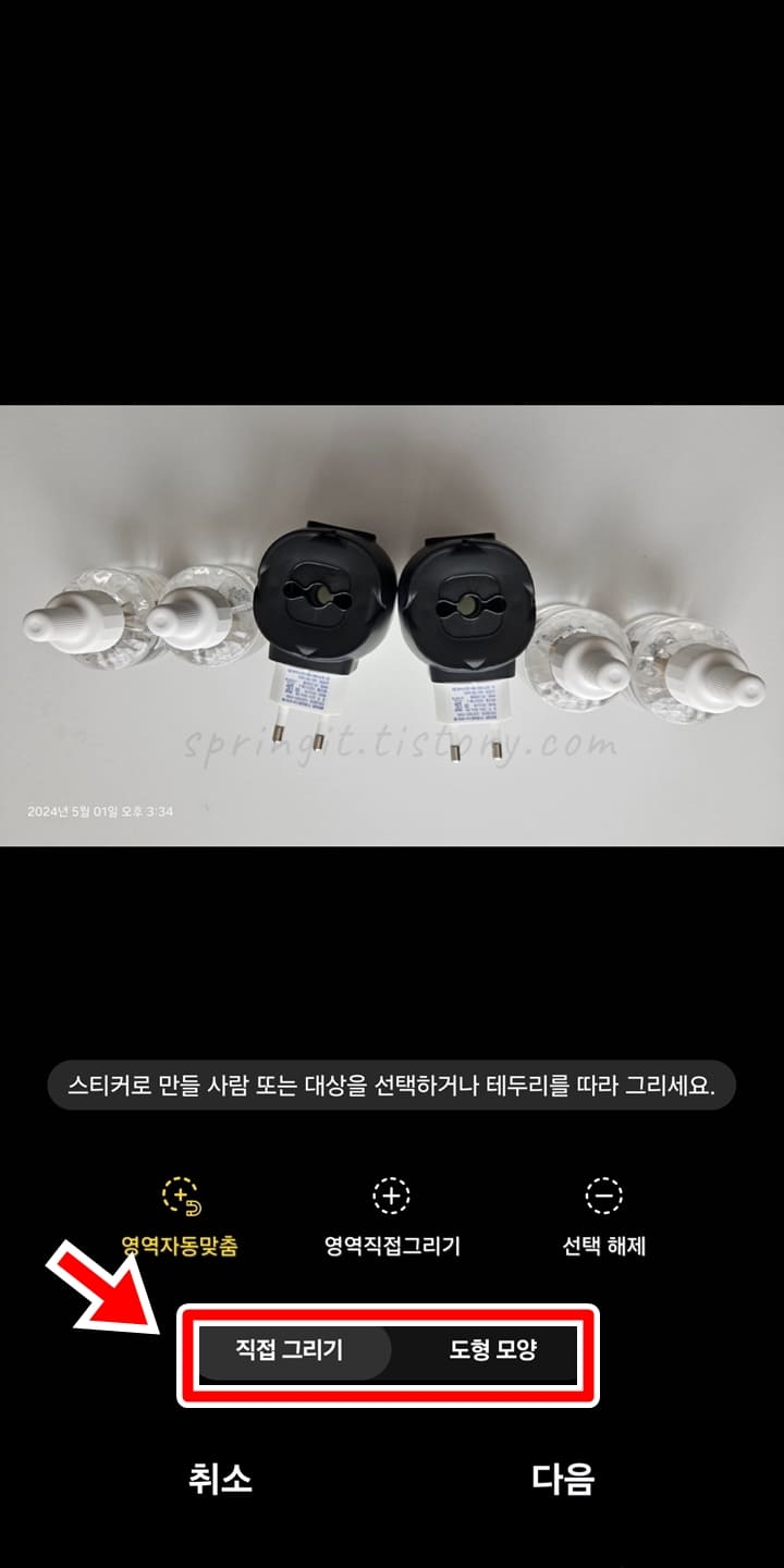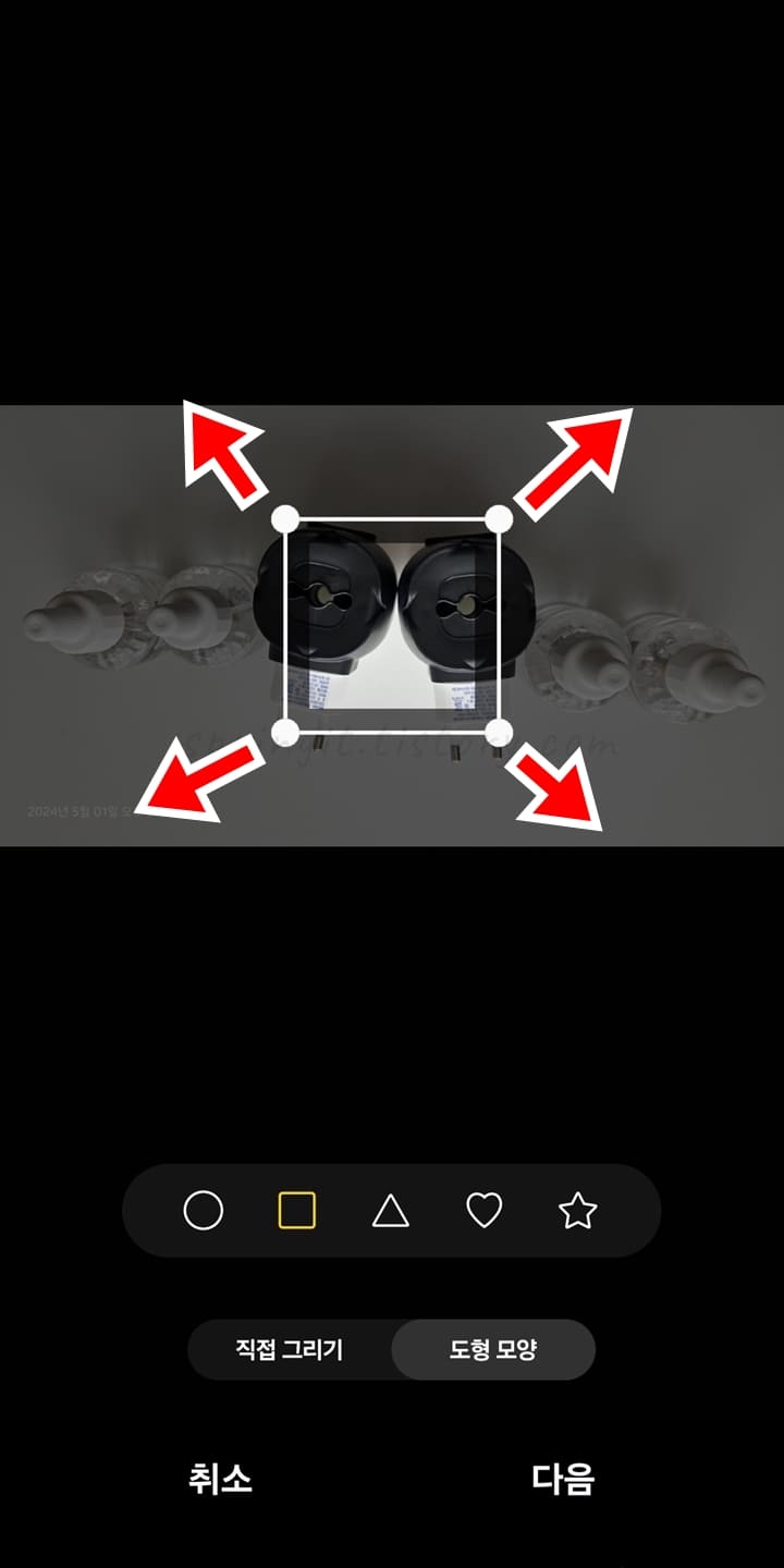 직접 그리기는 사진상에서 합치고 싶은 영역을 직접 손으로 그려 오리는 것을 의미하며 도형 모양은 삼각형, 사각형 등 정해진 모양대로 영역을 지정하여 오리는 것을 뜻합니다.
