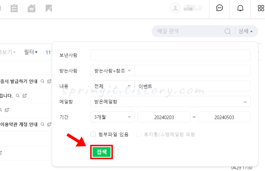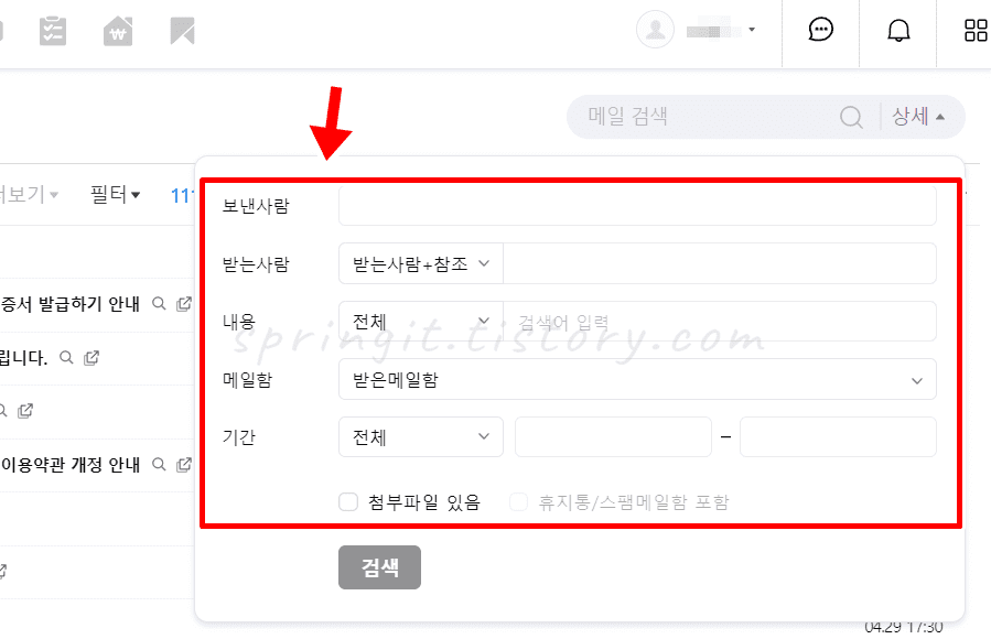 4. 찾고자 하는 메일의 상세 내역을 입력합니다.