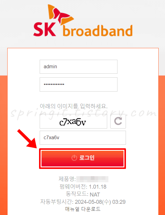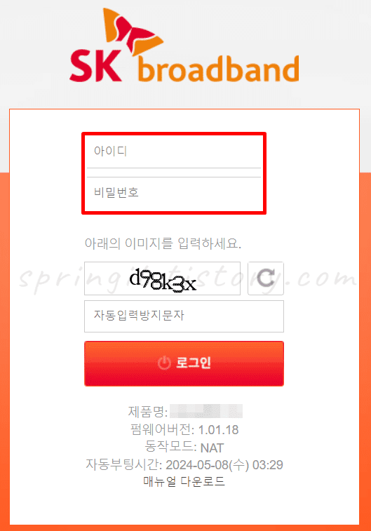 SK브로드밴드 관리자 아이디는 admin입니다.
