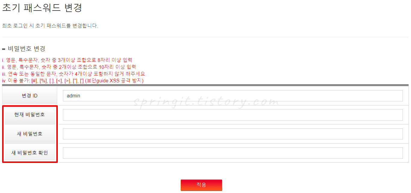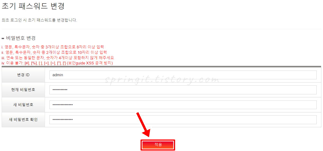 9. 현재 비밀번호 및 새 비밀번호를 두번 입력합니다.