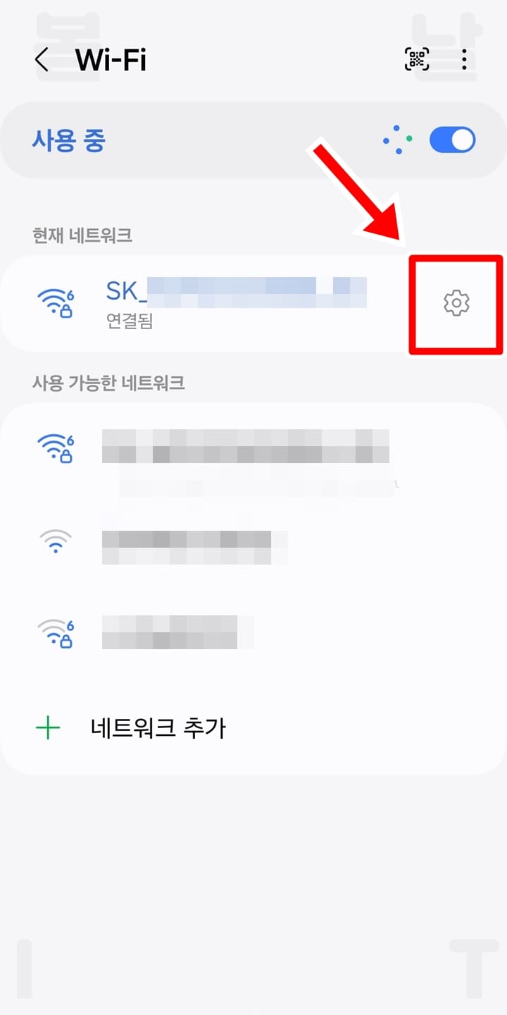 4. 현재 연결된 SK 와이파이의 우측 설정 버튼을 누릅니다.
