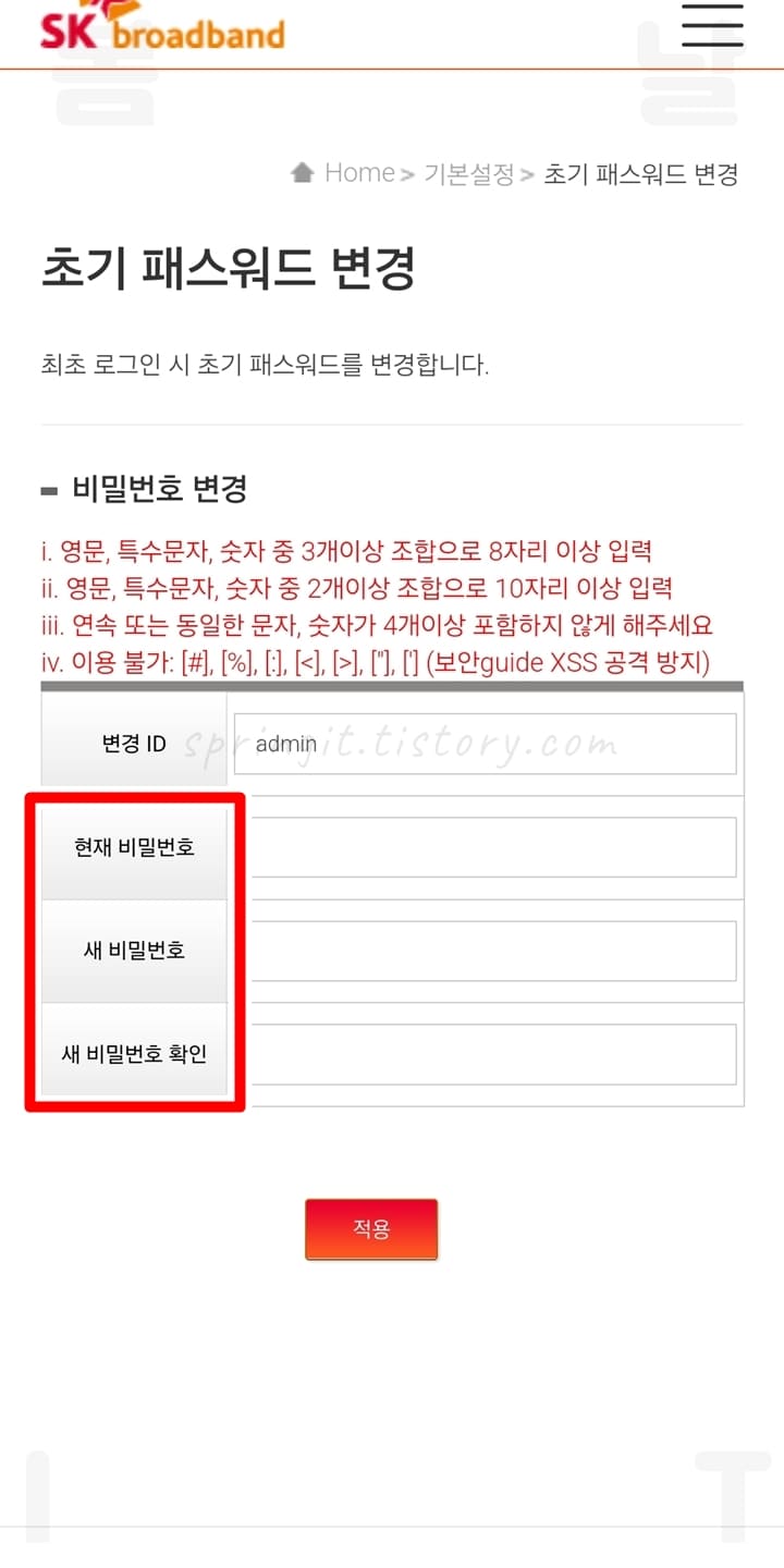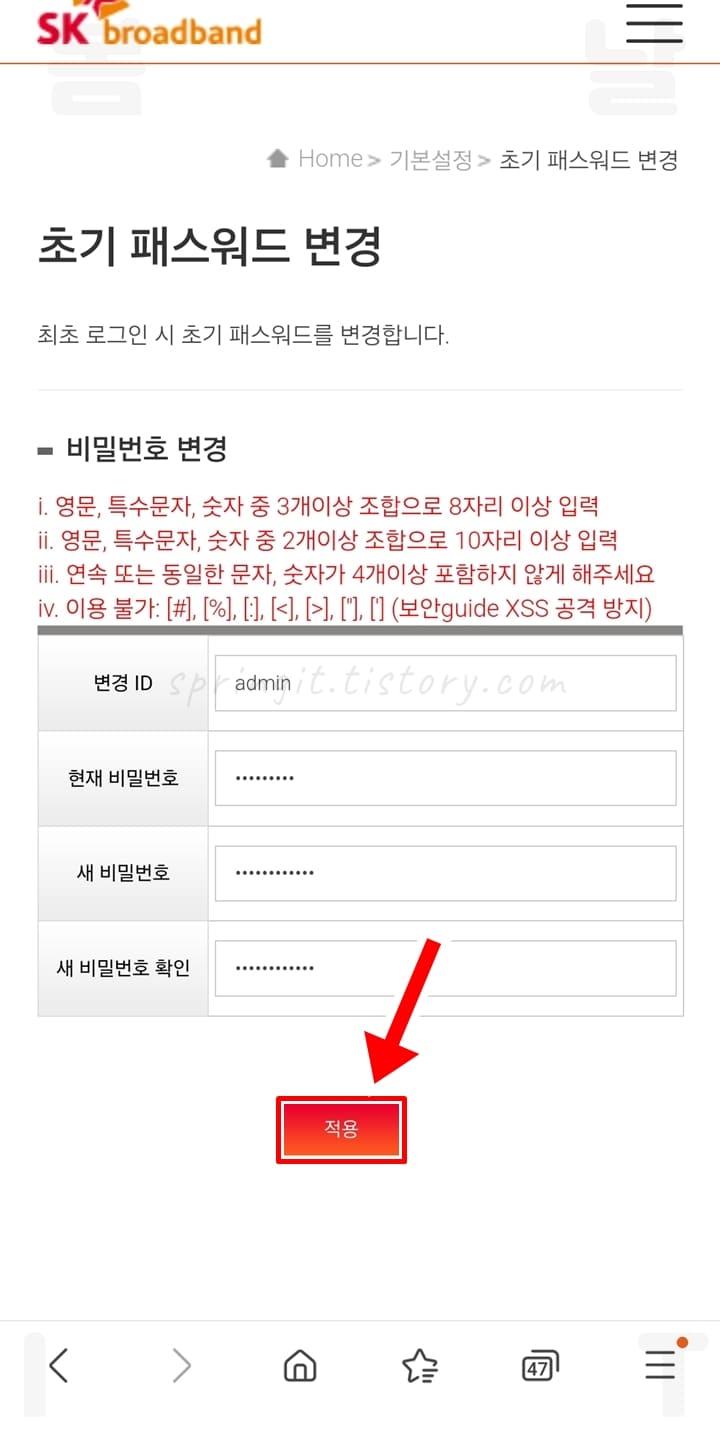 참고로 SK 와이파이 공유기 비밀번호 변경시 영문, 특수문자, 숫자 중 3개이상 조합으로 8자리 이상 입력하거나 2개 이상 조합을 10자리 이상 입력해야 합니다. 연속 또는 동일한 문자, 숫자가 4개 이상 포함되면 안됩니다.