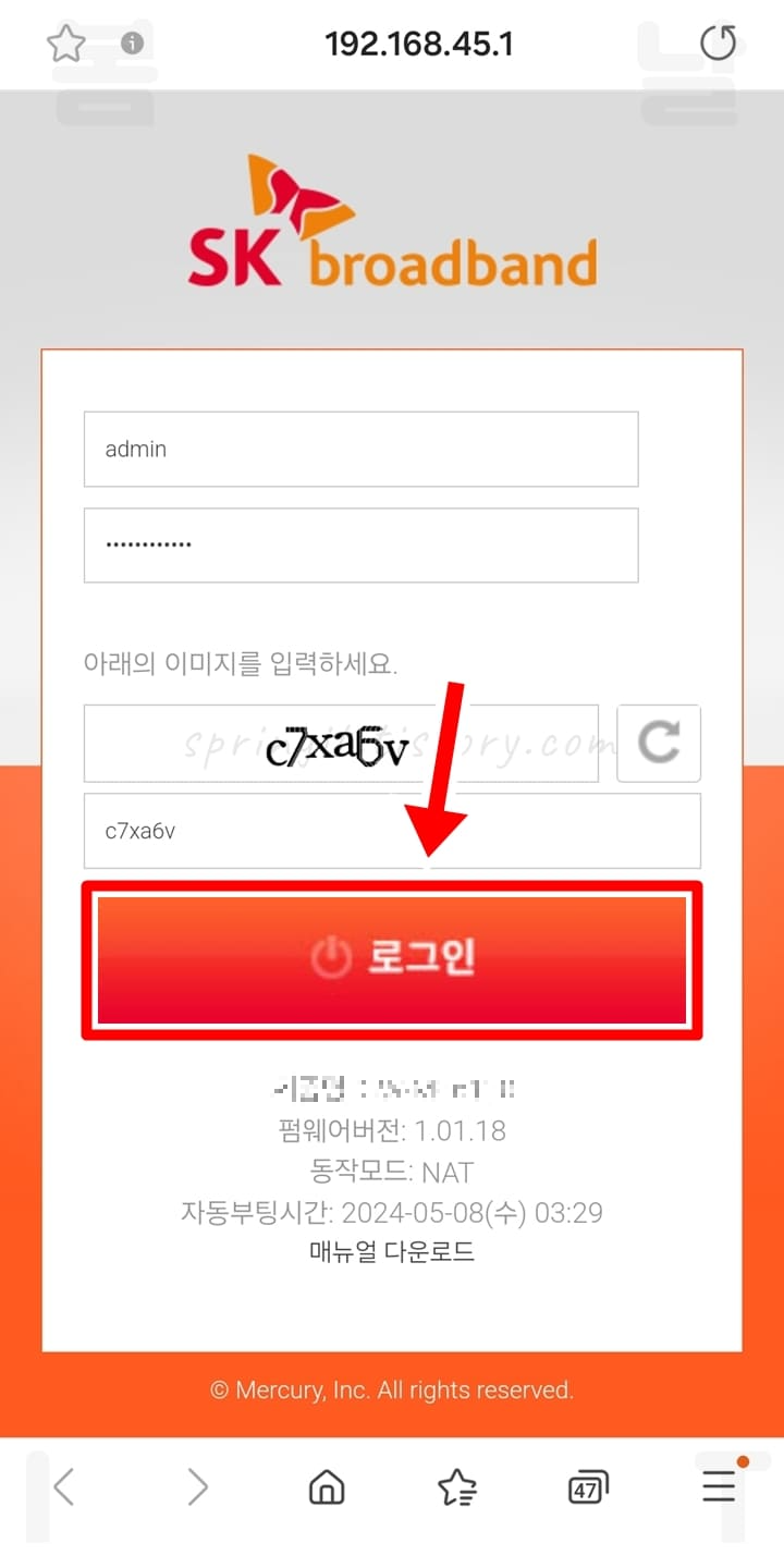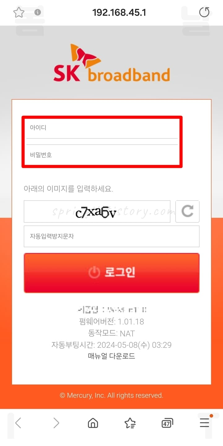아이디는 admin이며 비밀번호는 공유기 뒷면 MAC 뒷부분 굵은 표시 6자리 문자 + _admin입니다. 상세한 방법은 위 PC 방법 문단에 소개되어 있으니 잘 모르시겠다면 위에서 확인 후 다시 돌아오시길 춴드립니다.