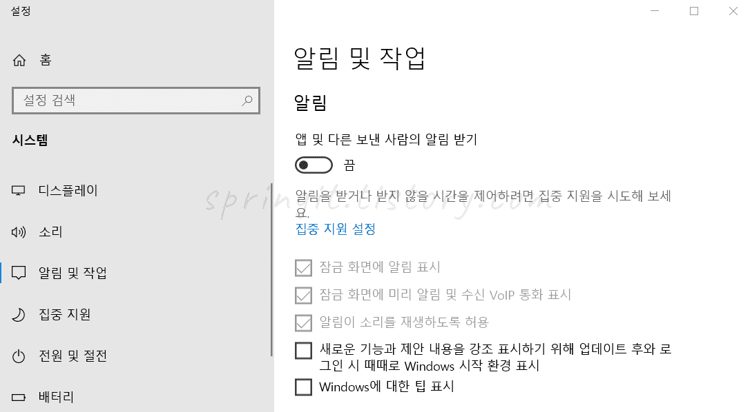 알림을 꺼주더라도 새로운 기능과 제안 내용을 강조 표시하기 위해 업데이트 후와 로그인시 때때로 Windows 시작 환경 표시 및 Windows에 대한 팁 표시 이렇게 2개의 세부 설정 알림은 꺼지지 않기에 직접 체크를 해제해주셔야 합니다.