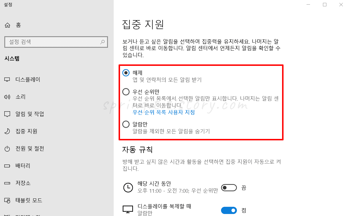 집중 지원에서 보거나 듣고 싶은 알림을 설정하시면 됩니다. 해제, 우선 순위만, 알람만 중에서 하나를 체크하시면 됩니다. 이 때 우선 순위만을 체크하시면 우선 순위 목록을 사용자가 직접 지정해줘야 합니다.