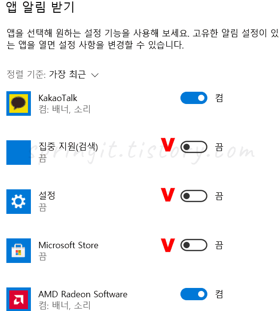 아래로 내리시면 '앱 알림 받기' 목록을 보실 수 있습니다. 이곳에서 알림을 받고 싶지 않은 프로그램은 모두 끔으로 설정해주시면 됩니다. 그러면 켬 표시된(내게 중요한) 프로그램의 알림 메시지만 알림센터에서 확인할 수 있습니다.
