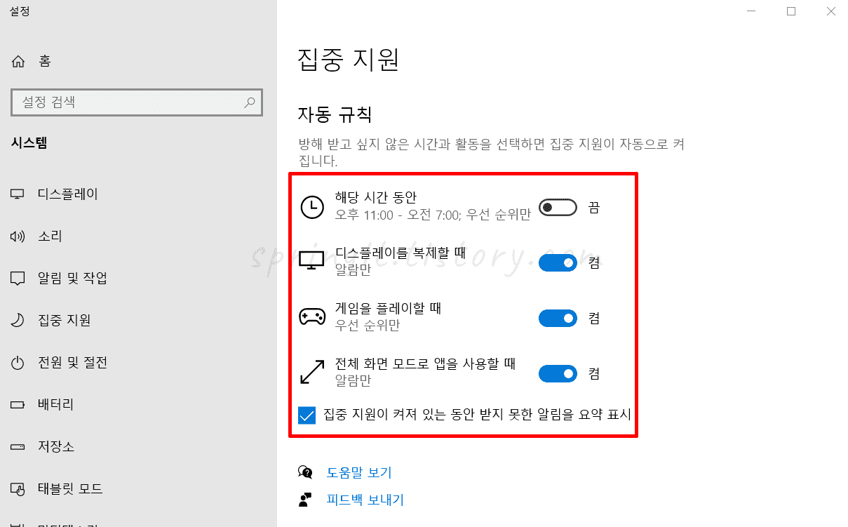 자동 규칙에서 방해 받고 싶지 않은 시간과 활동을 선택해서 사용할 수 있습니다. 해당 시간 동안, 디스플레이를 복제할 때, 게임을 플레이할 때, 전체 화면 모드로 앱을 사용할 때 중에서 선택해서 켬으로 변경하시면 됩니다.