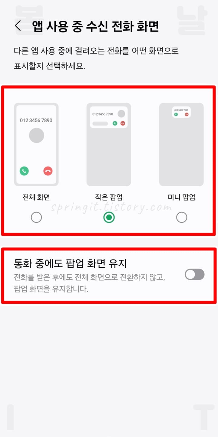 여기까지 봄날의 아이티에서는 갤럭시 전화통화 수신화면 설정 방법 2가지를 소개해드렸습니다. 이렇게 수신되는 전화의 배경화면을 내가 원하는 사진으로 변경하는 것부터 앱 사용중 수신화면 UI를 변경하는 것까지 가능하니 본인의 개성대로 꾸며 이용해보시길 바랍니다. 감사합니다.