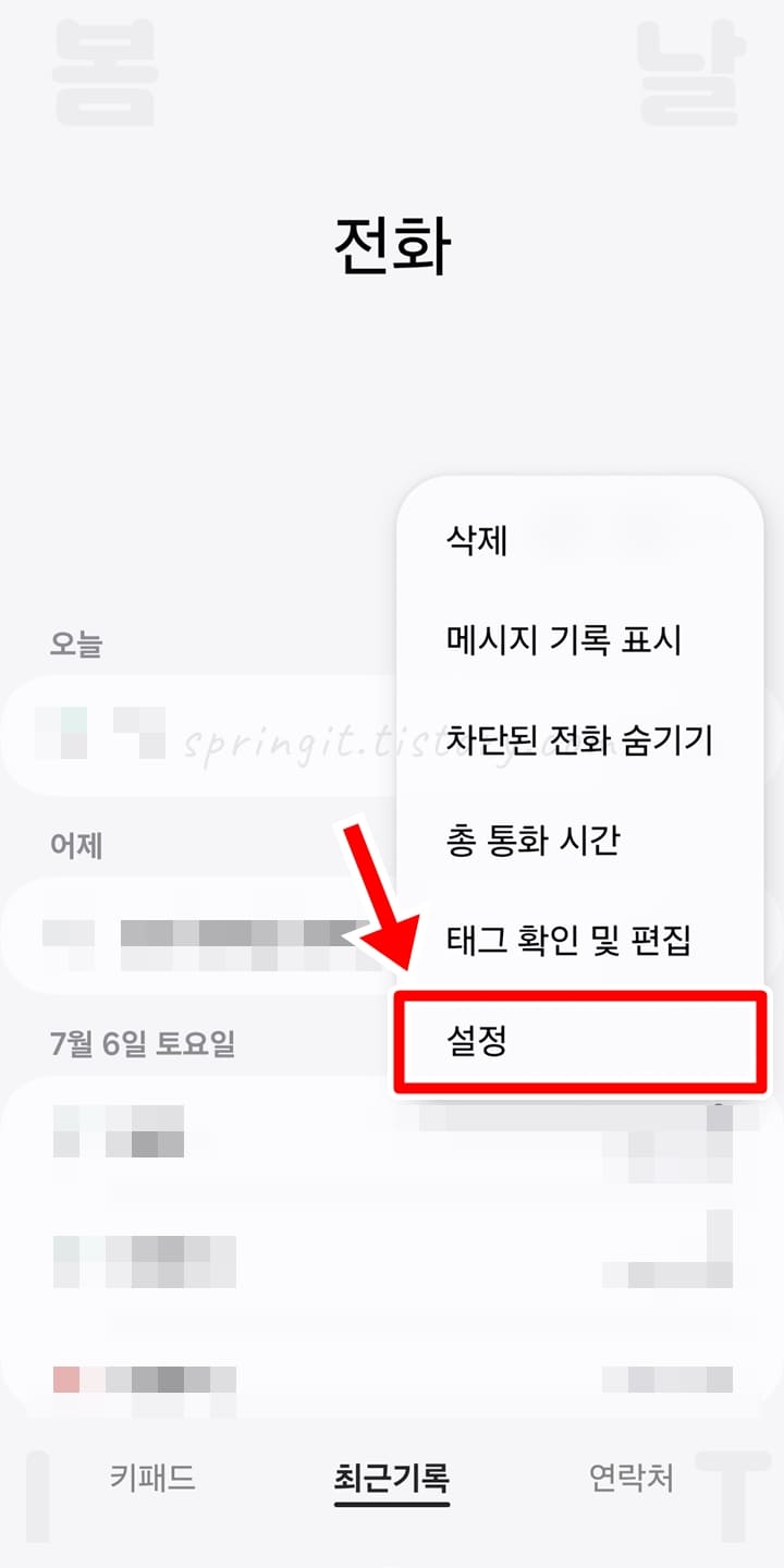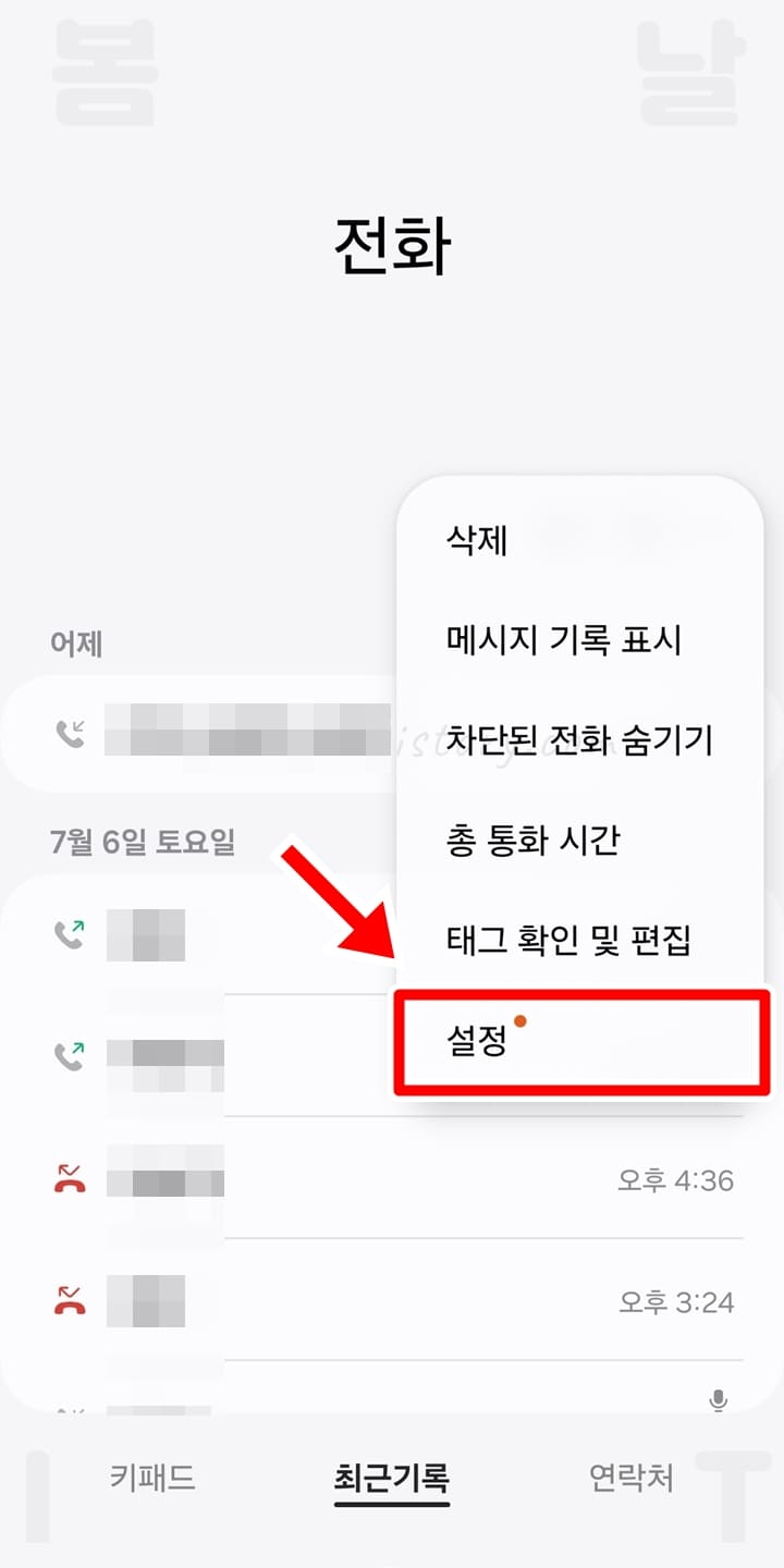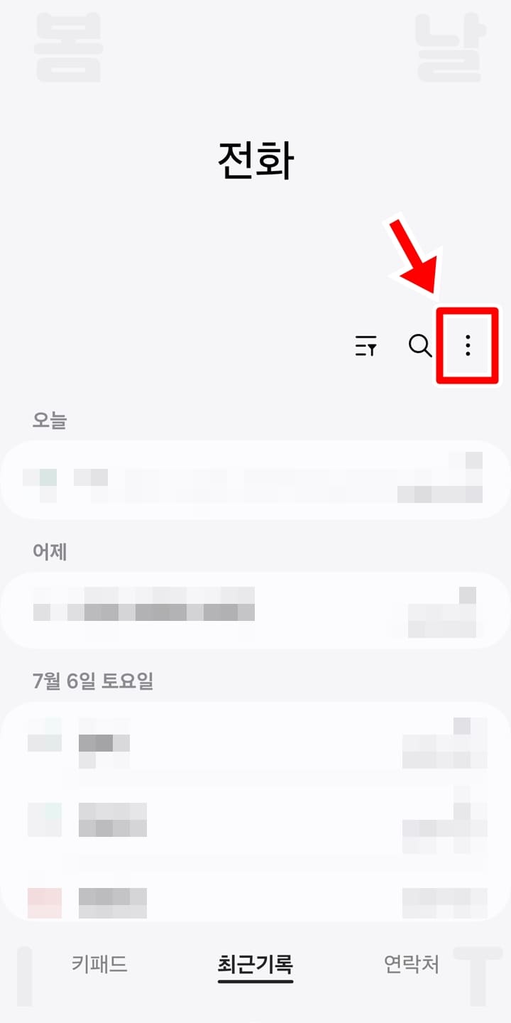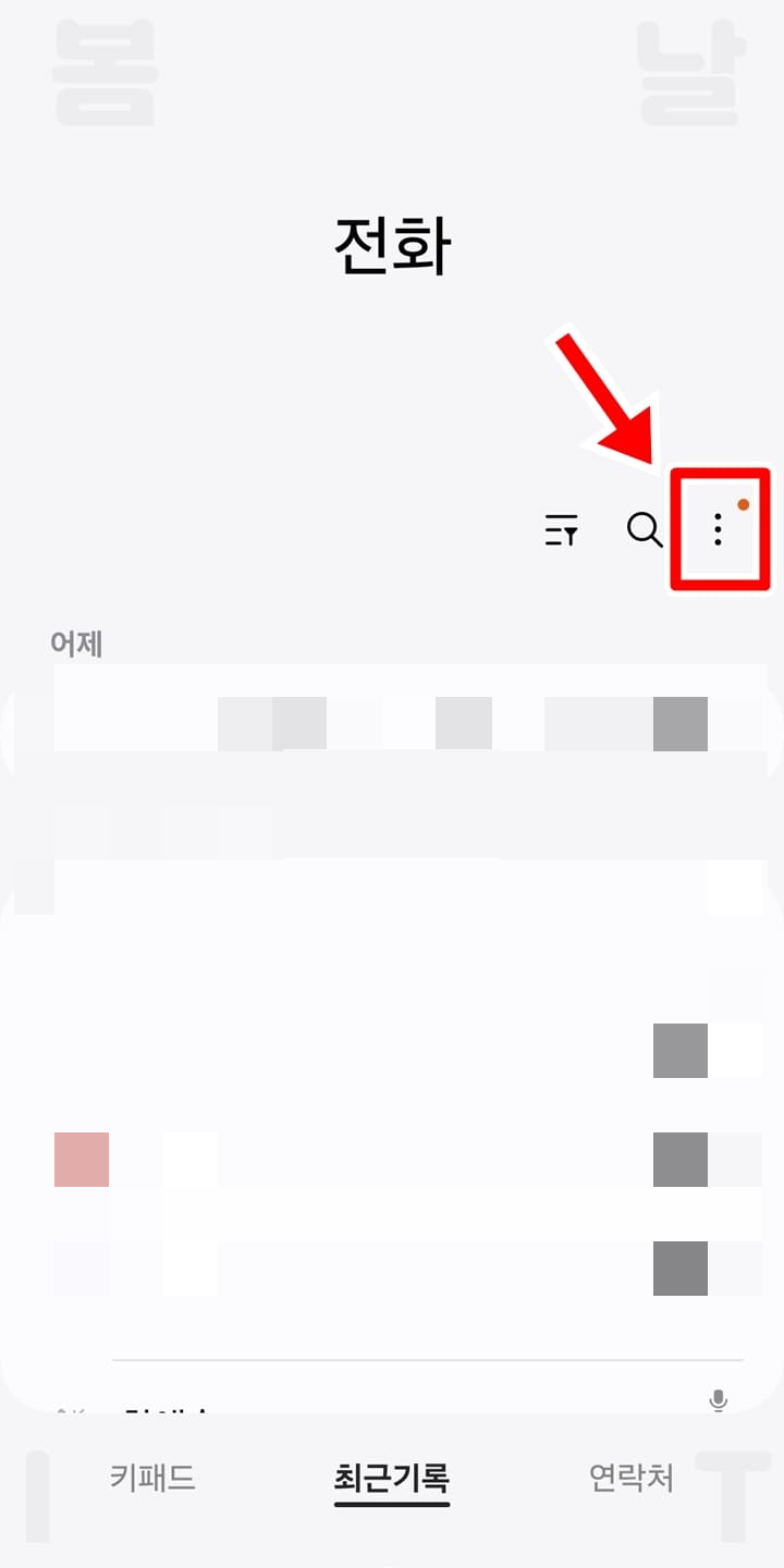 1. 갤럭시 전화 앱에서 더보기 버튼을 누릅니다.