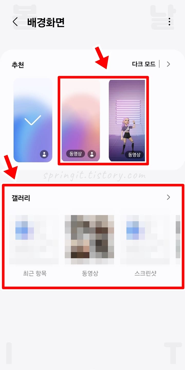 추천에서는 기본으로 제공되는 배경화면 사진, 동영상, AR 이미지에서 선택이 가능합니다. 아래에서는 갤러리를 눌러 내가 촬영하거나 다운로드받은 사진, 동영상으로 통화화면에 설정하여 이용할 수 있습니다.