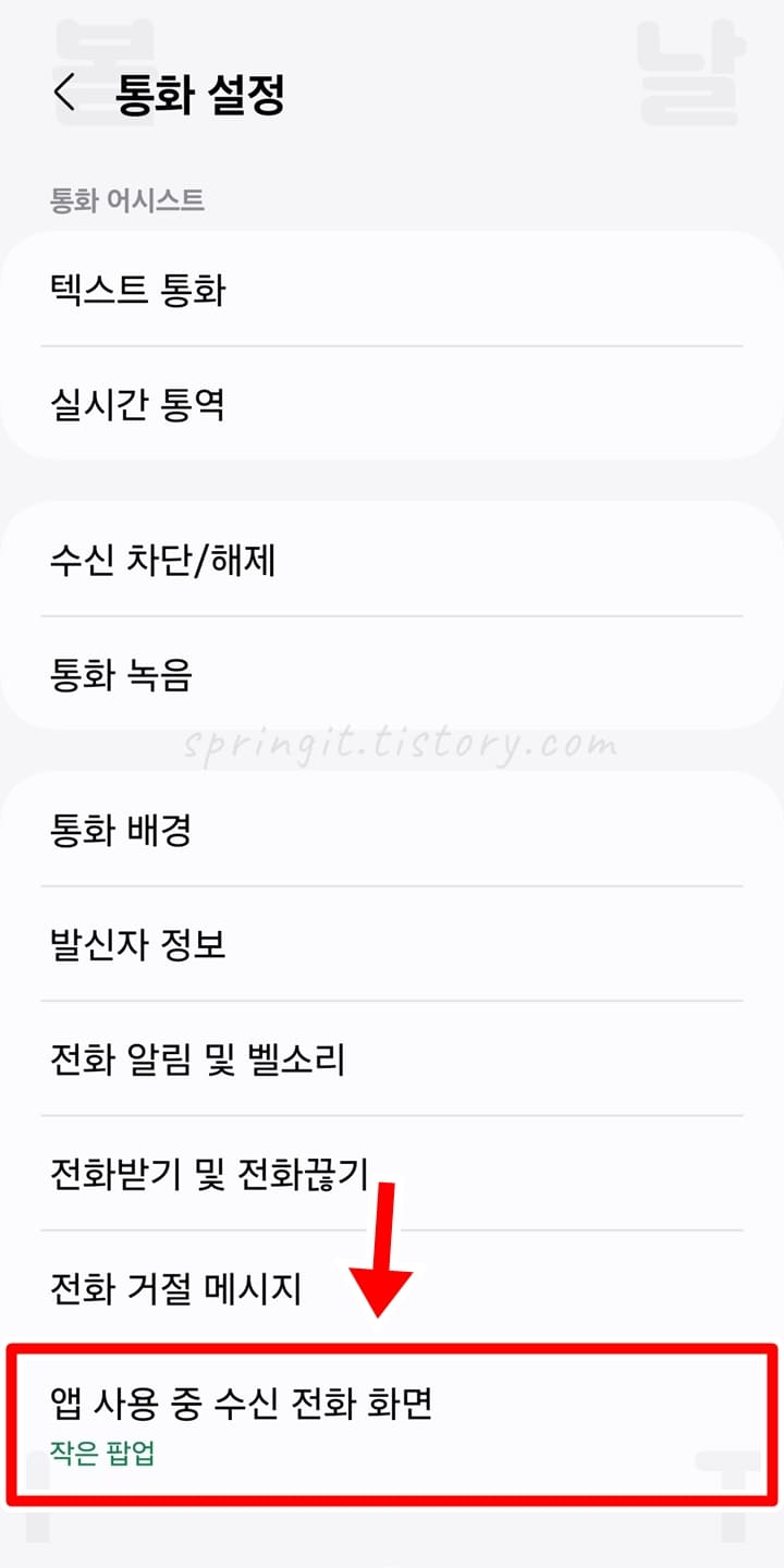 3. 앱 사용 중 수신 전화 화면을 클릭합니다.