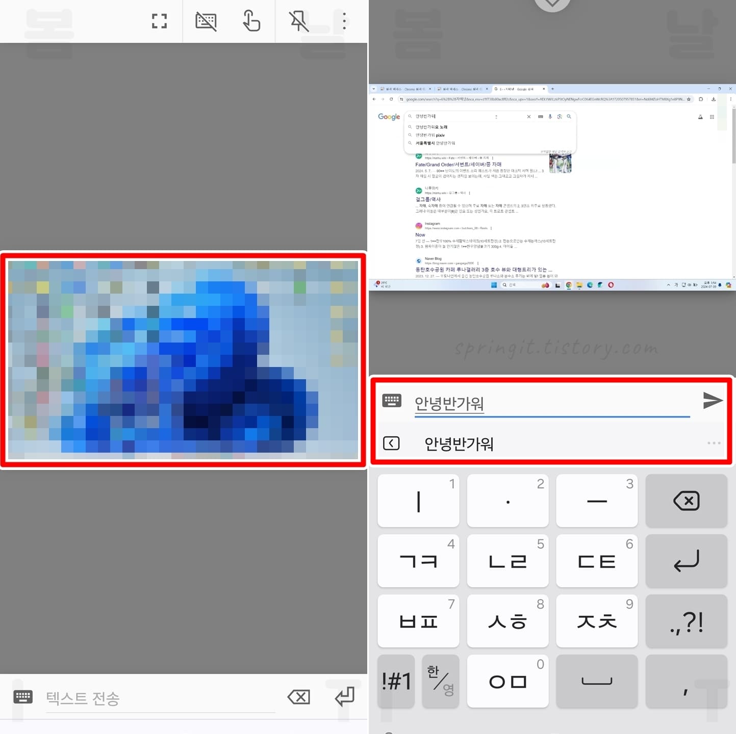 - 키보드 입력: 키보드 입력창을 더블클릭한 후 키보드에 문자 입력 후 전송 버튼을 누르면 PC에 입력됩니다.
