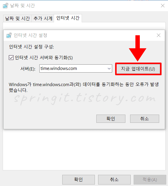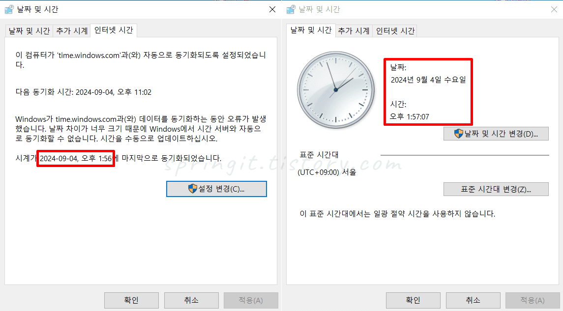 이제 컴퓨터에서 시간과 날짜가 맞춰지면 일정 기간마다 자동 동기화하여 컴퓨타 시계 오류가 발생하지 않게 됩니다. 하지만 오랜시간 컴퓨터를 사용하지 않을 경우나 동기화 오류가 발생할 경우 다시 시간이 너무 먼 과거로 설정되어 있습니다 오류 발생하게 되니 이럴땐 이번 글의 방법으로 다시 시간을 맞춰주시길 바랍니다. 감사합니다.