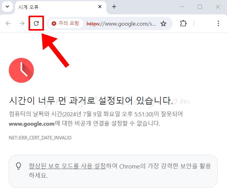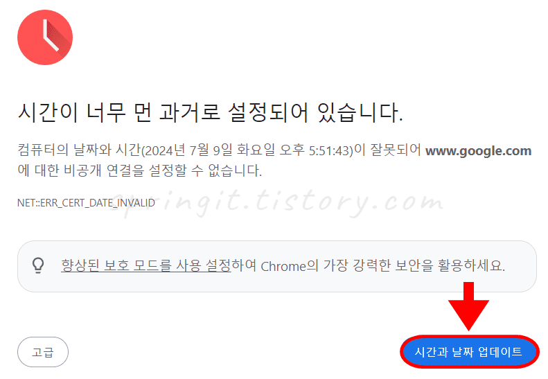 8. 시간이 너무 먼 과거로 설정되어 있습니다 오류 페이지로 접속합니다.