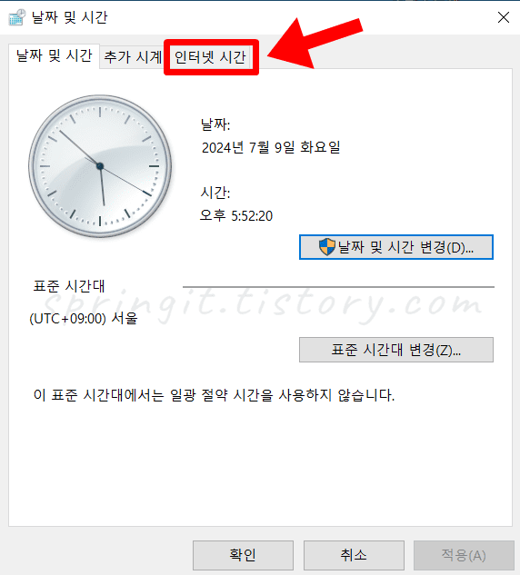 3. 윈도우 날짜 및 시간창이 표시되면 인터넷 시간을 클릭합니다.