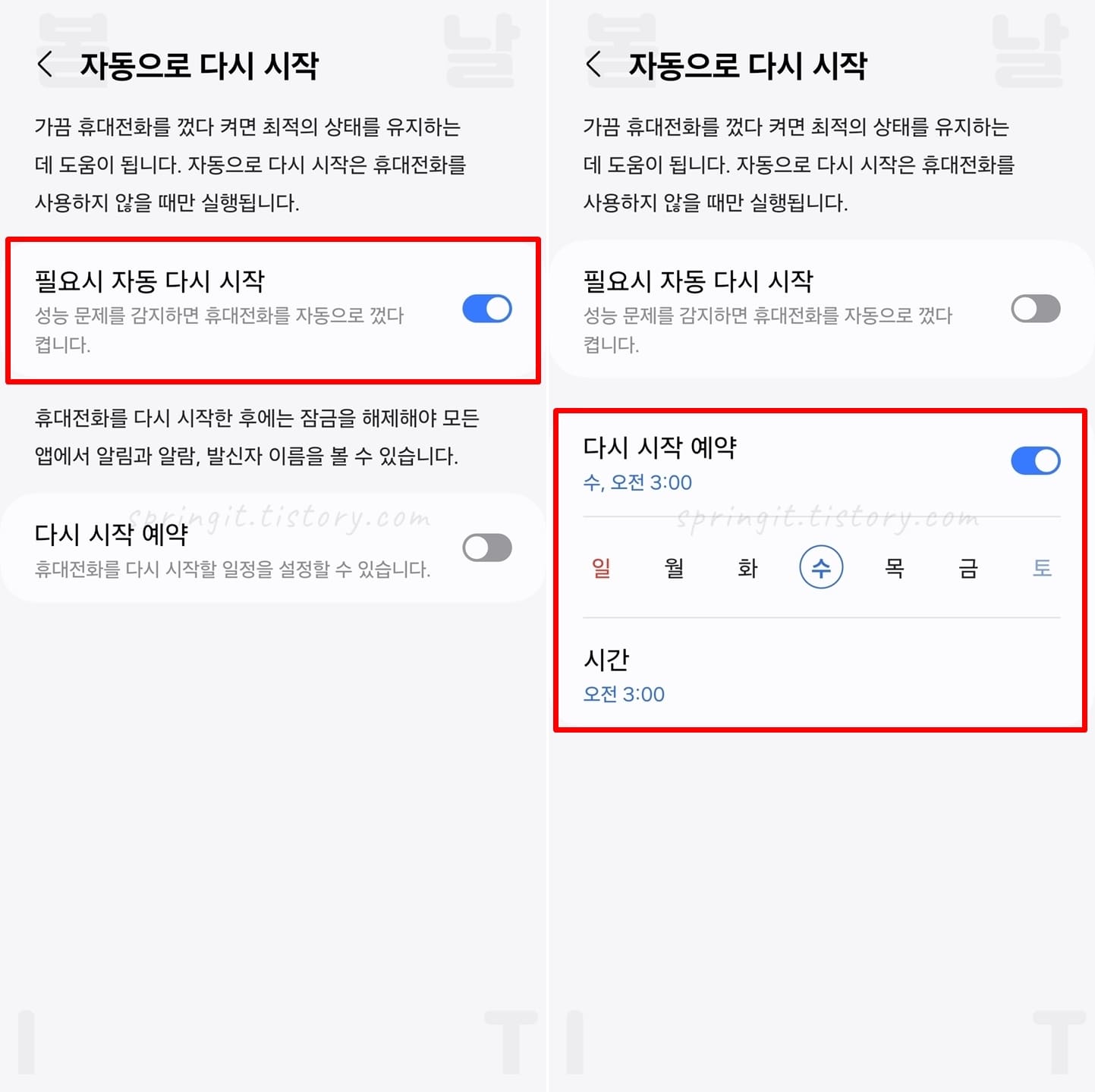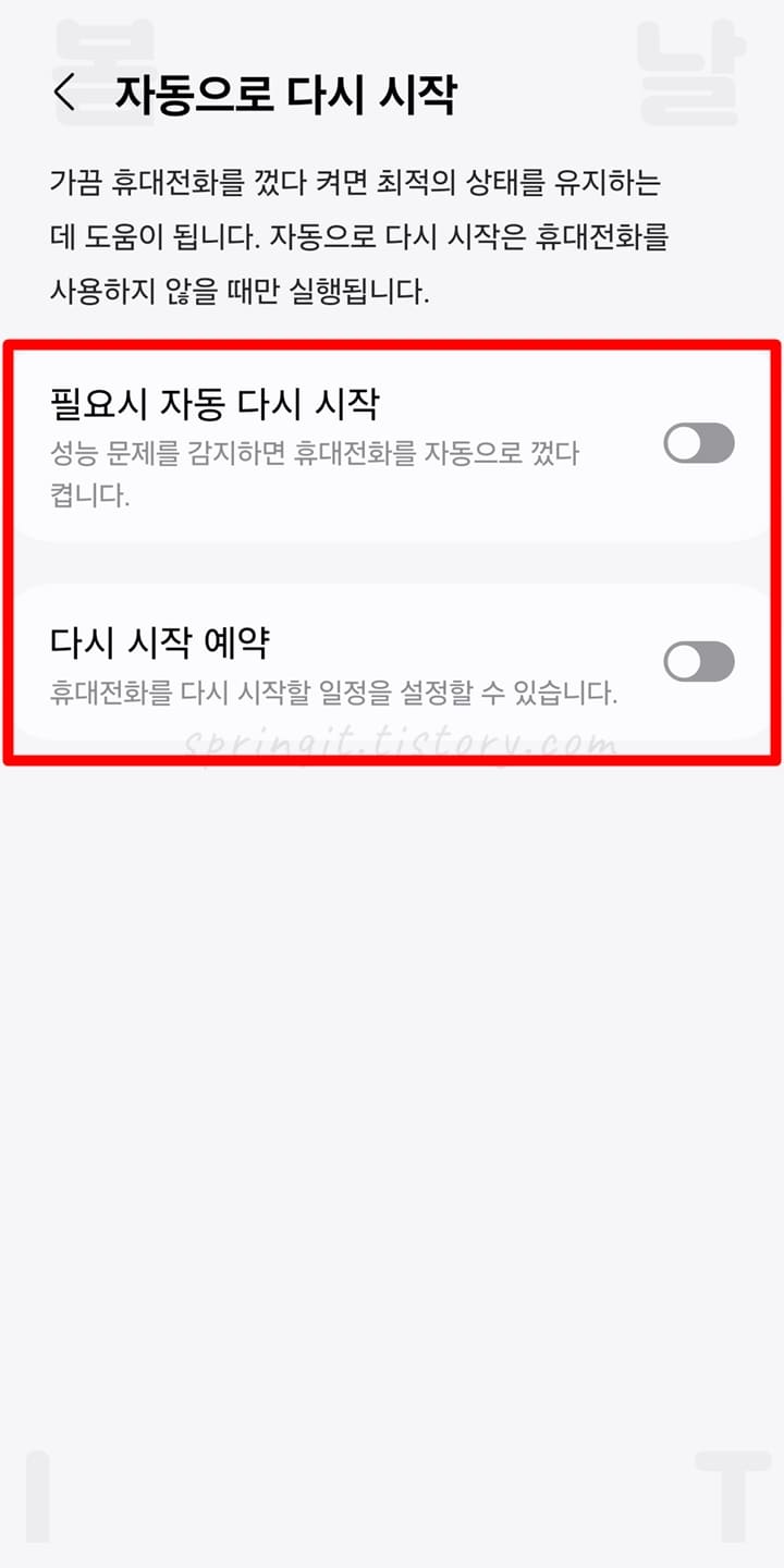 여기까지 봄날의 아이티에서는 갤럭시 자동 재부팅 설정 방법 2가지를 소개드렸습니다. 이렇게 갤럭시에서는 자체 기능으로 재부팅을 할 수 있 수 있으니 별도의 앱을 이용하지 않고도 간단하게 사용할 수 있습니다. 스마트폰은 오랫동안 재부팅하지 않고 사용한다면 각종 오류나 느려짐 현상이 발생하는만큼 재부팅 기능을 꼭 활용해보시길 바랍니다. 감사합니다.