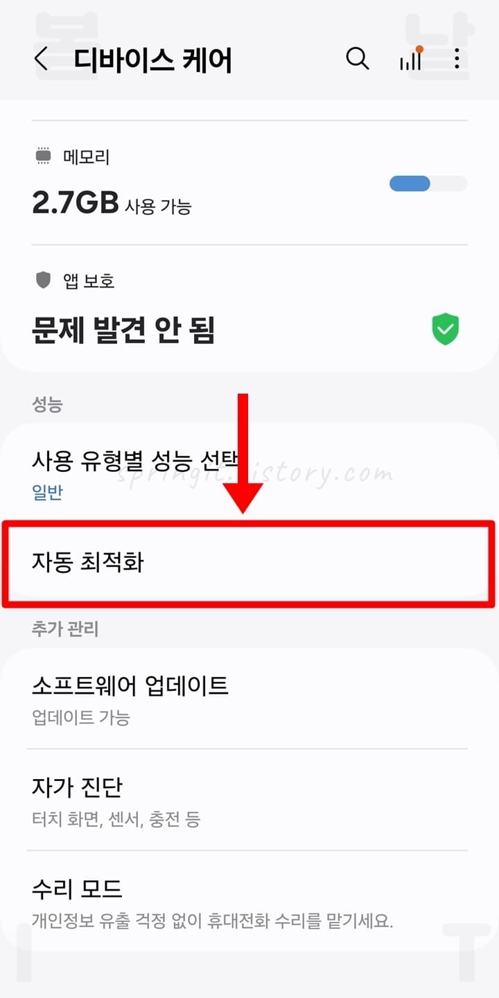 필요시 자동 다시 시작: 갤럭시에서 성능 문제를 감지하면 휴대 전화를 자동 재부팅이 시작됩니다. 자동으로 다시 시작될 땐 갤럭시를 사용하지 않을 때만 진행됩니다.