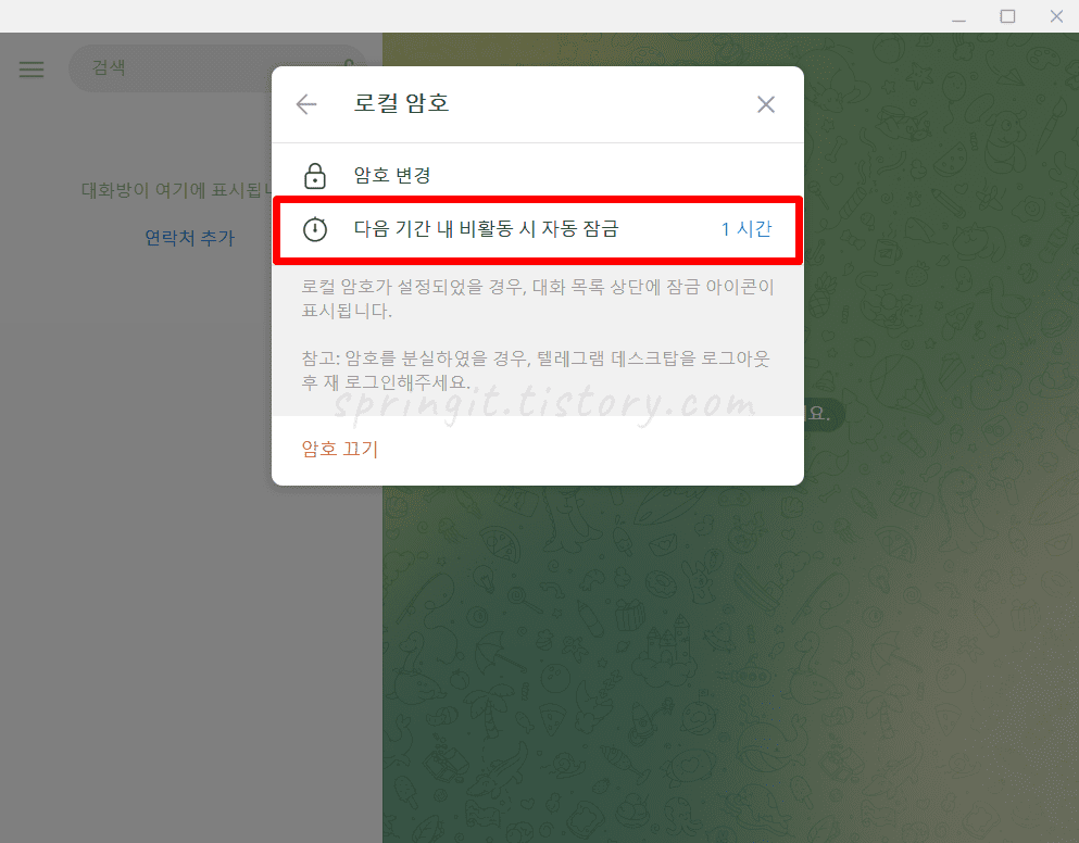 PC 메뉴의 같은 경로에서 암호를 변경하거나, 암호 해제, 다음 기간 내 비활동 시 자동 잠금 시간을 설정할 수 있습니다. 참고로 PC에서도 텔레그램을 사용하던도중 바로 잠그고 싶을 경우 대화 목록 상단의 잠금 아이콘을 누르세요.