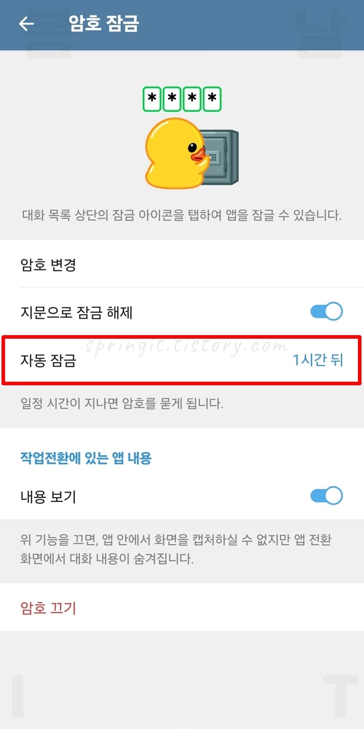 설정 > 개인 정보 및 보안 > 암호 잠금에서 암호변경, 지문으로 잠금 설정, 자동 잠금 시간 설정, 암호 해제 기능을 이용할 수 있습니다. 참고로 자동 잠금 시간이 되지 않더라도 대화 목록 상단의 잠금 아이콘을 탭하여 앱을 잠글 수 있습니다.