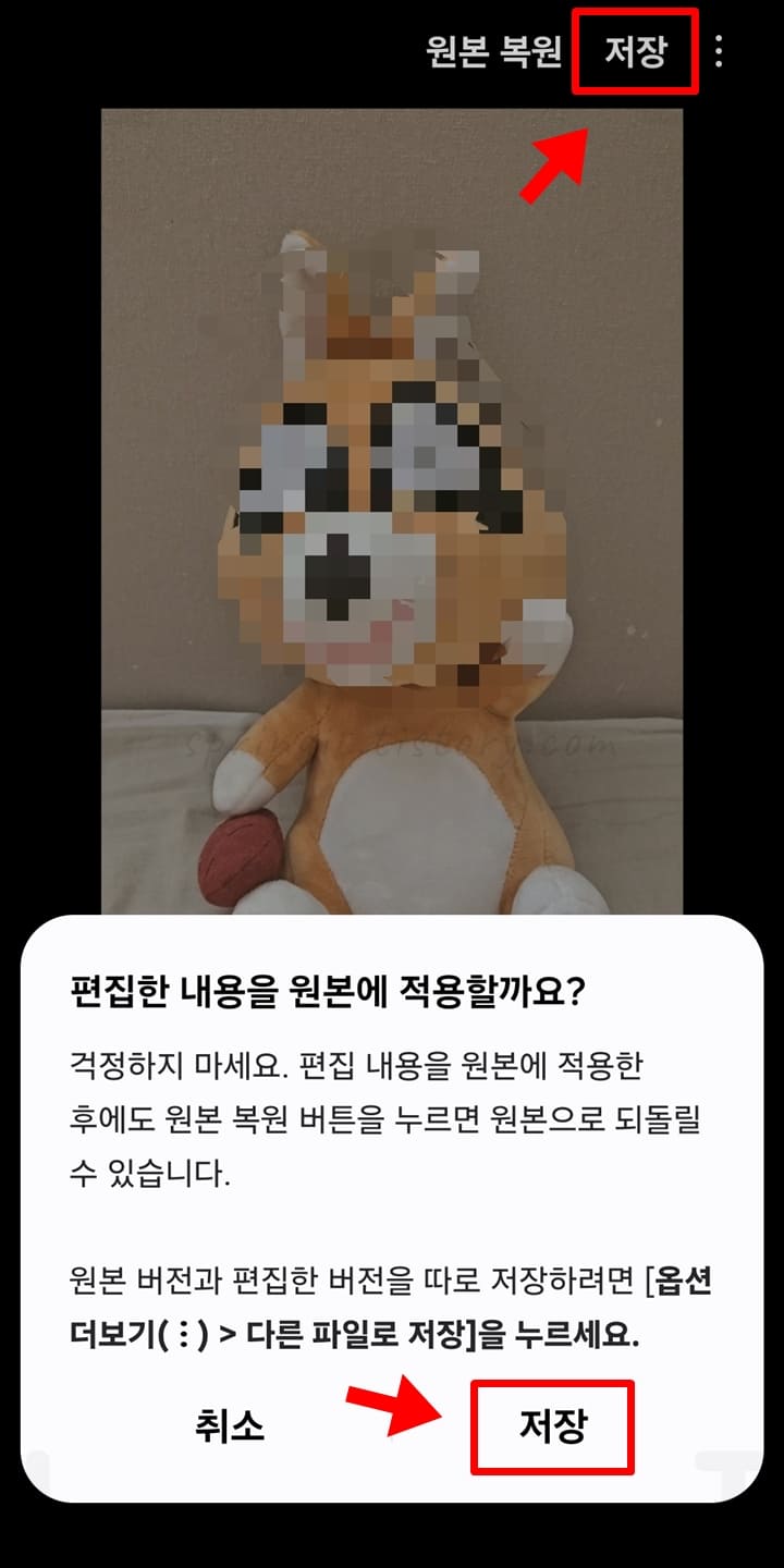 참고로 이렇게 모자이크 처리된 동영상은 언제든 편집 버튼 > 원본 복원 버튼을 눌러 원본으로 되돌릴 수 있습니다. 이젠 이렇게 기본 갤러리 앱을 활용하여 편하게 갤럭시 동영상을 모자이크 처리해보세요.