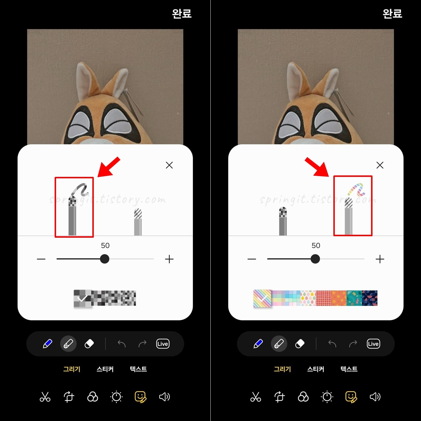 첫번째 모자이크 펜은 기본적인 모자이크 처리로 강도를 설정 후 이용할 수 있습니다. 두번째 모자이크 펜은 모자이크 효과 및 그림이 들어간 패턴을 함께 사용할 수 있습니다.
