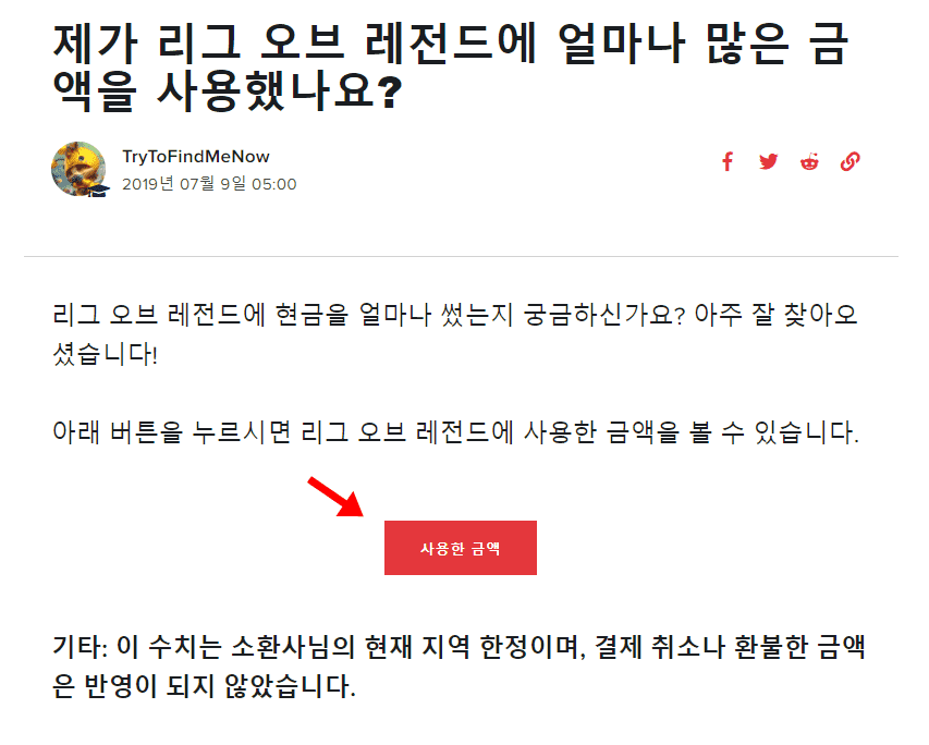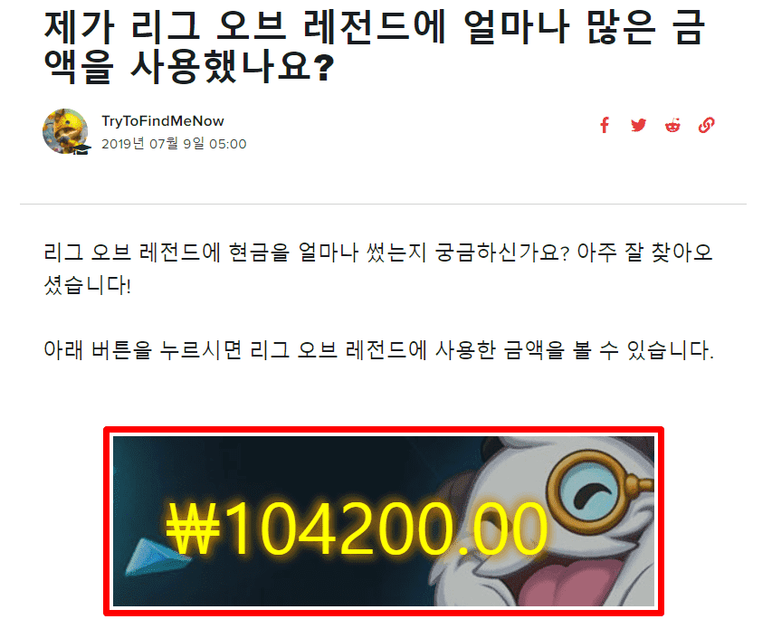 그래서 확인해보니 공식 리그오브레전드 사이트 고객센터에서는 로그인된 계정에서 현질한 결제 총 금액을 보여주는 기능이 있어서 이용해보았습니다. 전 조회해보니 다른 의미로 깜짝놀랐는데 과거에 현질을 많이 했던 걸로 기억하나 직장이 없던 시기여서 그런지 생각보다 작은 돈을 썻더군요. 이렇게 정확한 한국 원화 금액을 확인할 수 있으니 이용해보세요.