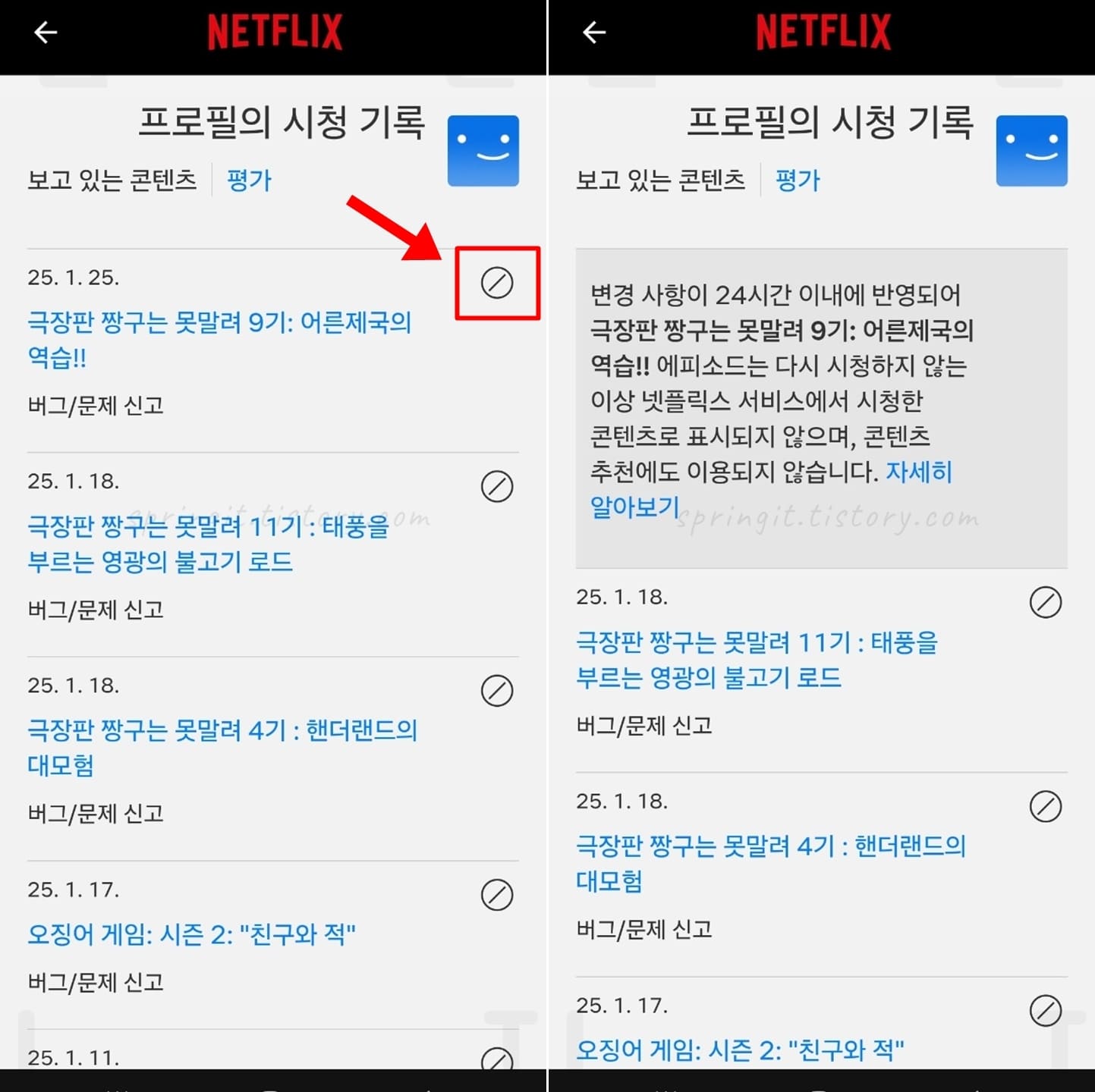 해당 컨텐츠는 시청기록에서 즉시 삭제되며 시청한 콘텐츠로 표시되지 않고 콘텐츠 추천 알고리즘에도 이용되지 않습니다.