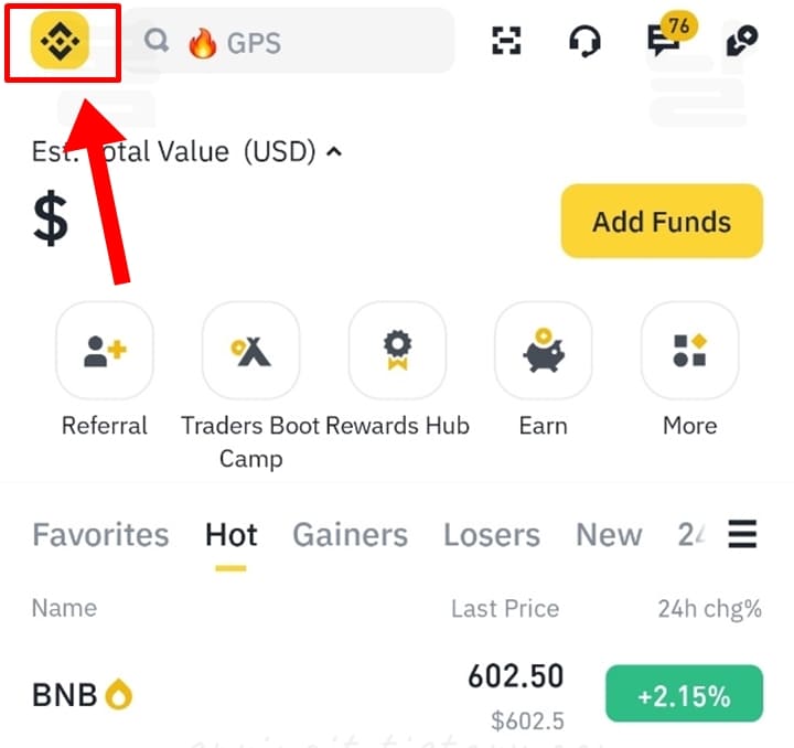 2. 좌측 상단에서 바이낸스 모양의 마크를 클릭합니다.