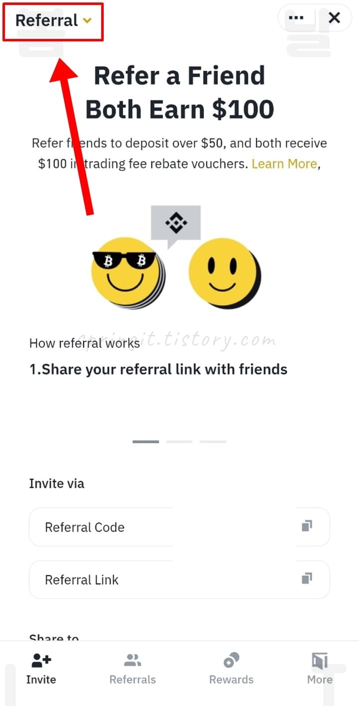 1) Referral Code = 내가 가입시 입력했던 레퍼럴 아이디 코드명입니다.