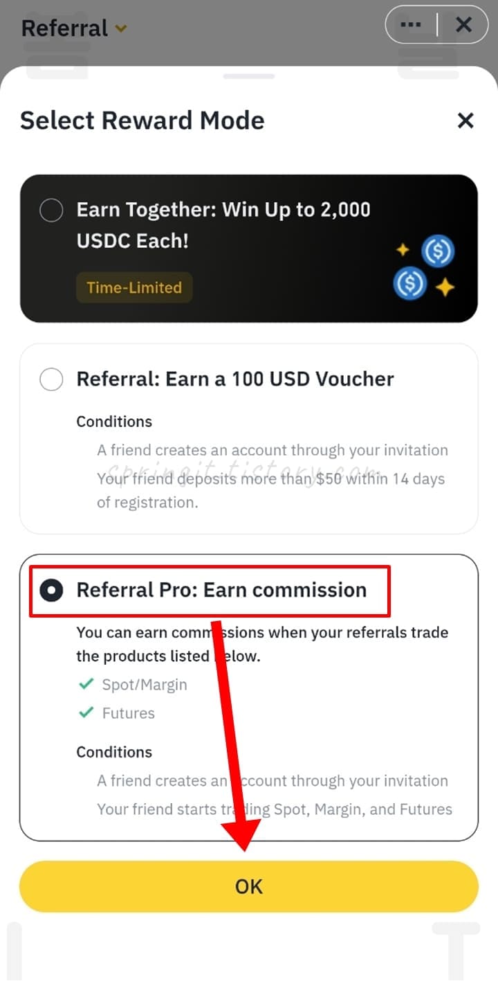 5. Referral Pro: Earn commission 옵션을 선택하고 OK를 클릭합니다.