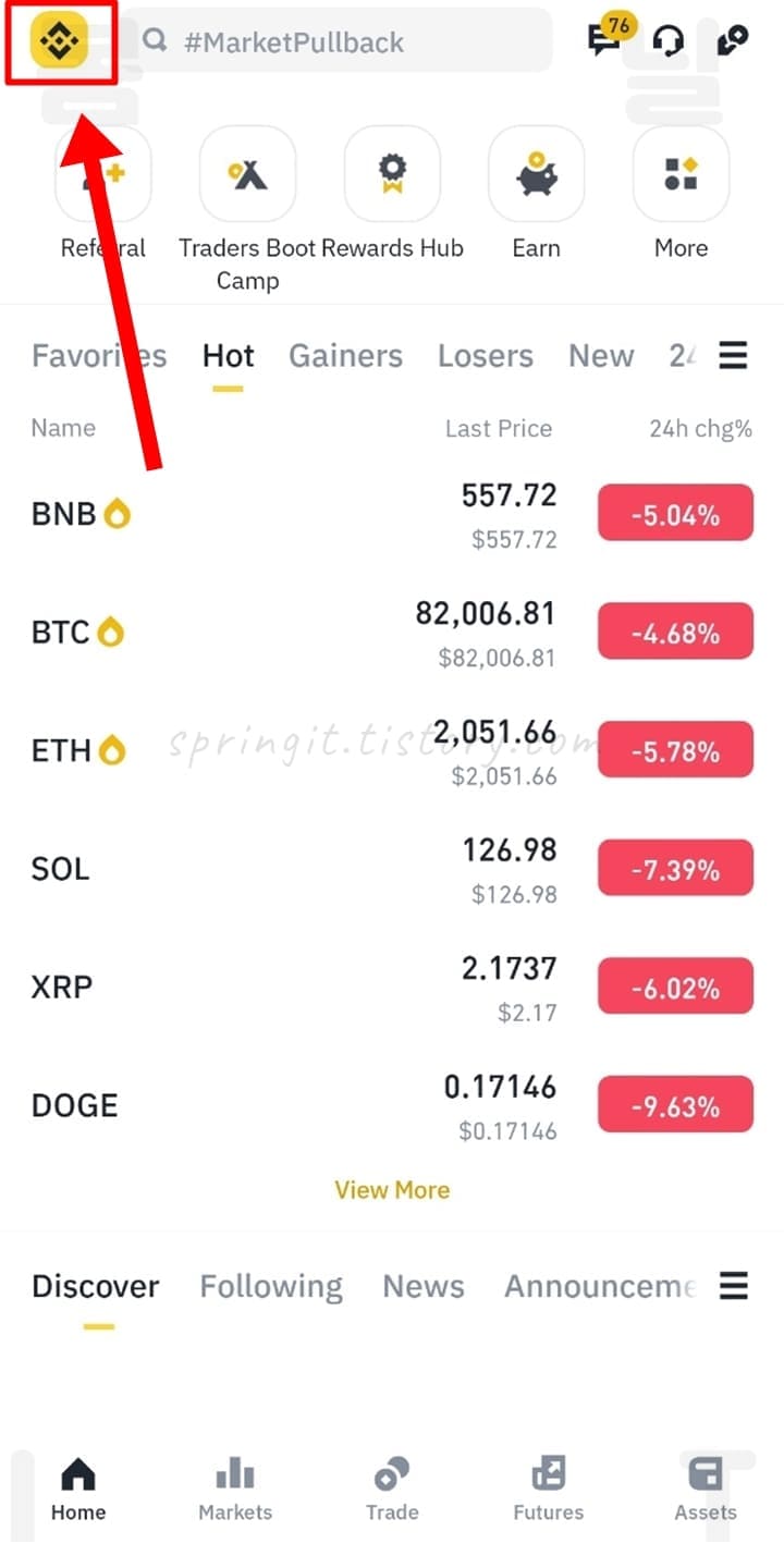 1. 모바일에서 바이낸스 앱을 실행합니다.