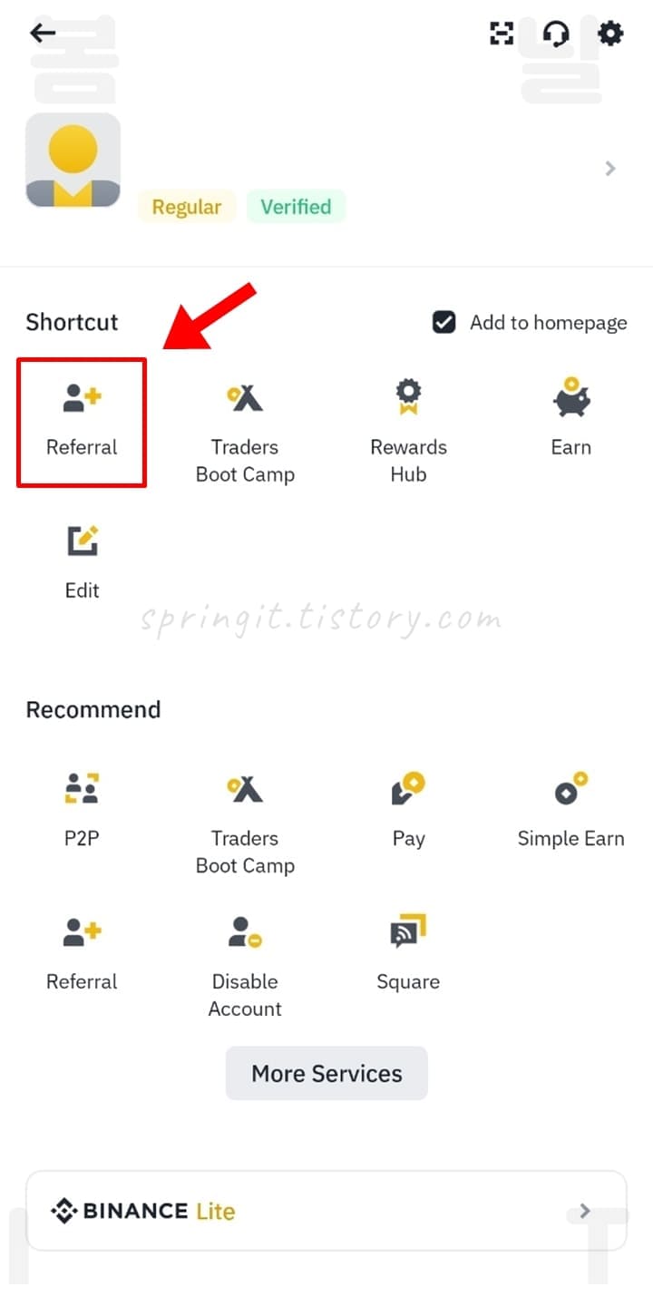 첫 화면에서 Referral 메뉴가 보이지 않는다면 화면 아래의 More Services를 눌러 메뉴를 찾아 선택하시면 됩니다.